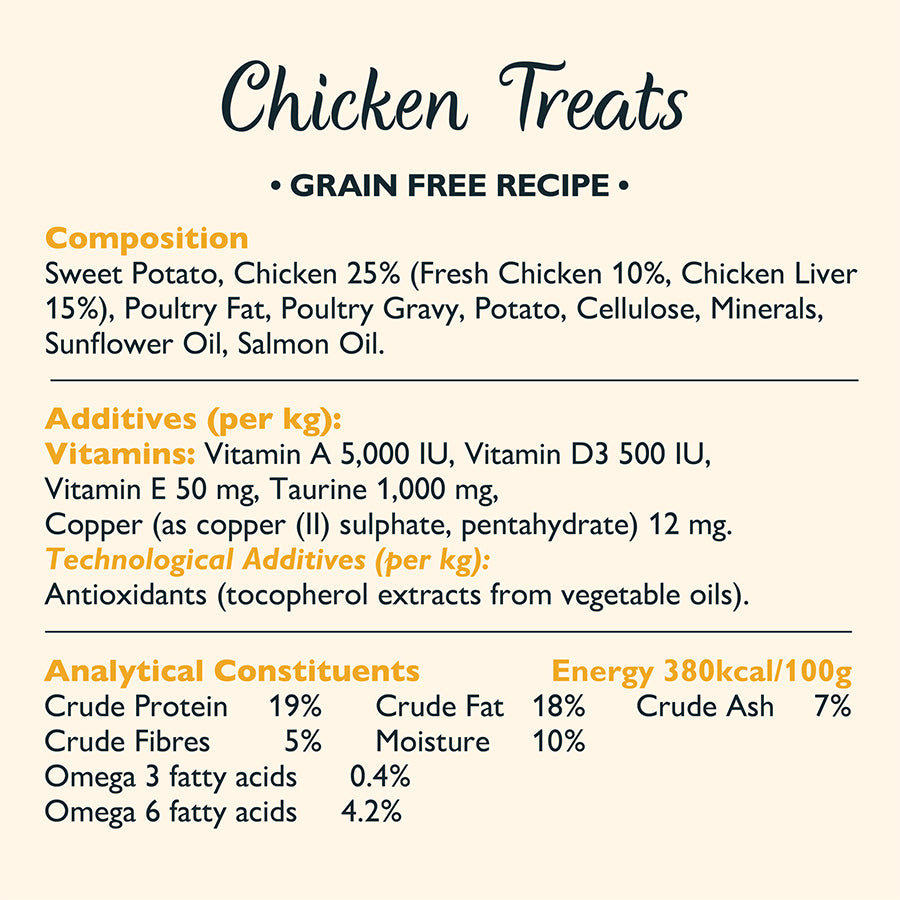 Sweet Potato, Chicken 25% (Fresh Chicken 10%, Chicken Liver 15%), Poultry Fat, Poultry Gravy, Potato, Cellulose, Minerals, Sunflower Oil, Salmon Oil