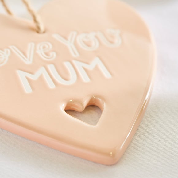 A heartfelt way to show Mum just how much she means to you - this charming heart-shaped ceramic plaque features a delicate heart cutout and soft pink finish, beautifully complemented by white typography. The ‘Love You Mum’ message adds a sentimental touch, making it a thoughtful gift for Mother’s Day or any special occasion. Perfect for hanging on a wall, door handle, or display hook, it brings warmth and love to any space. A simple yet meaningful keepsake she’ll cherish forever.