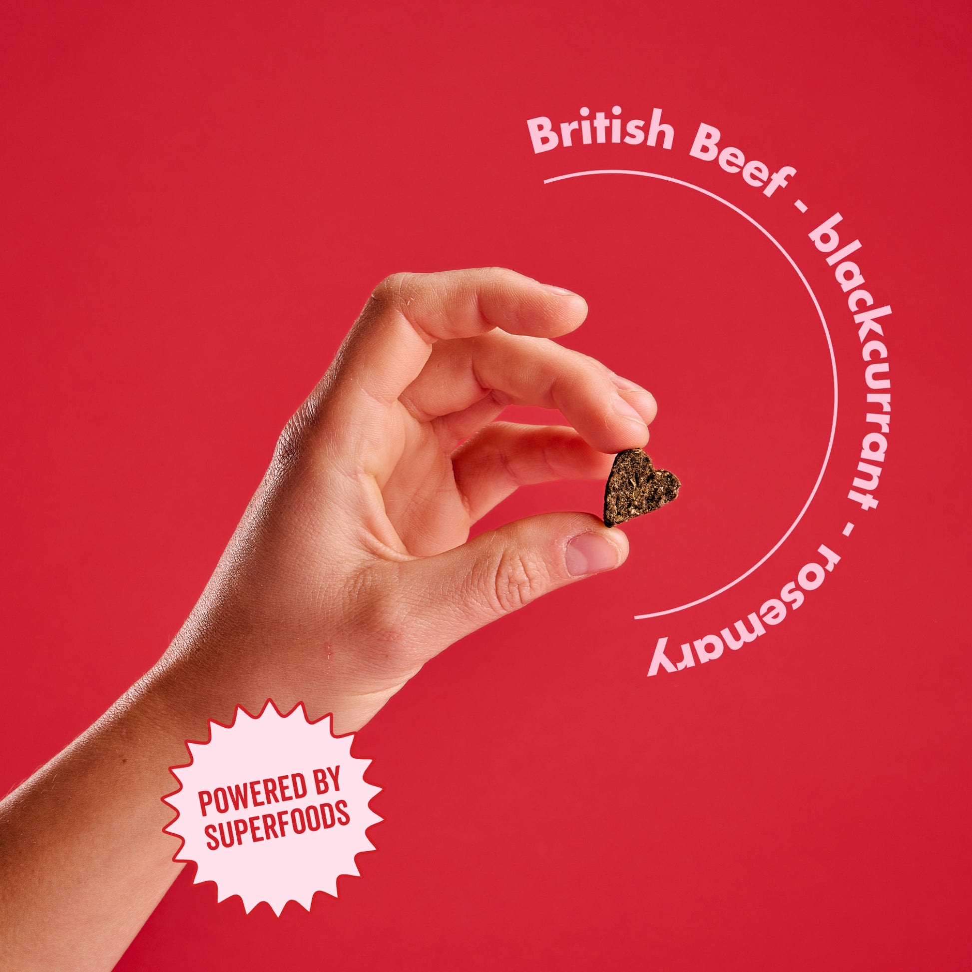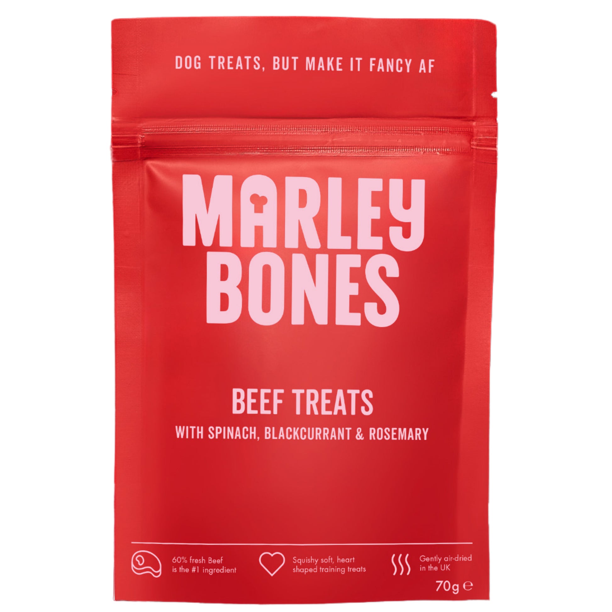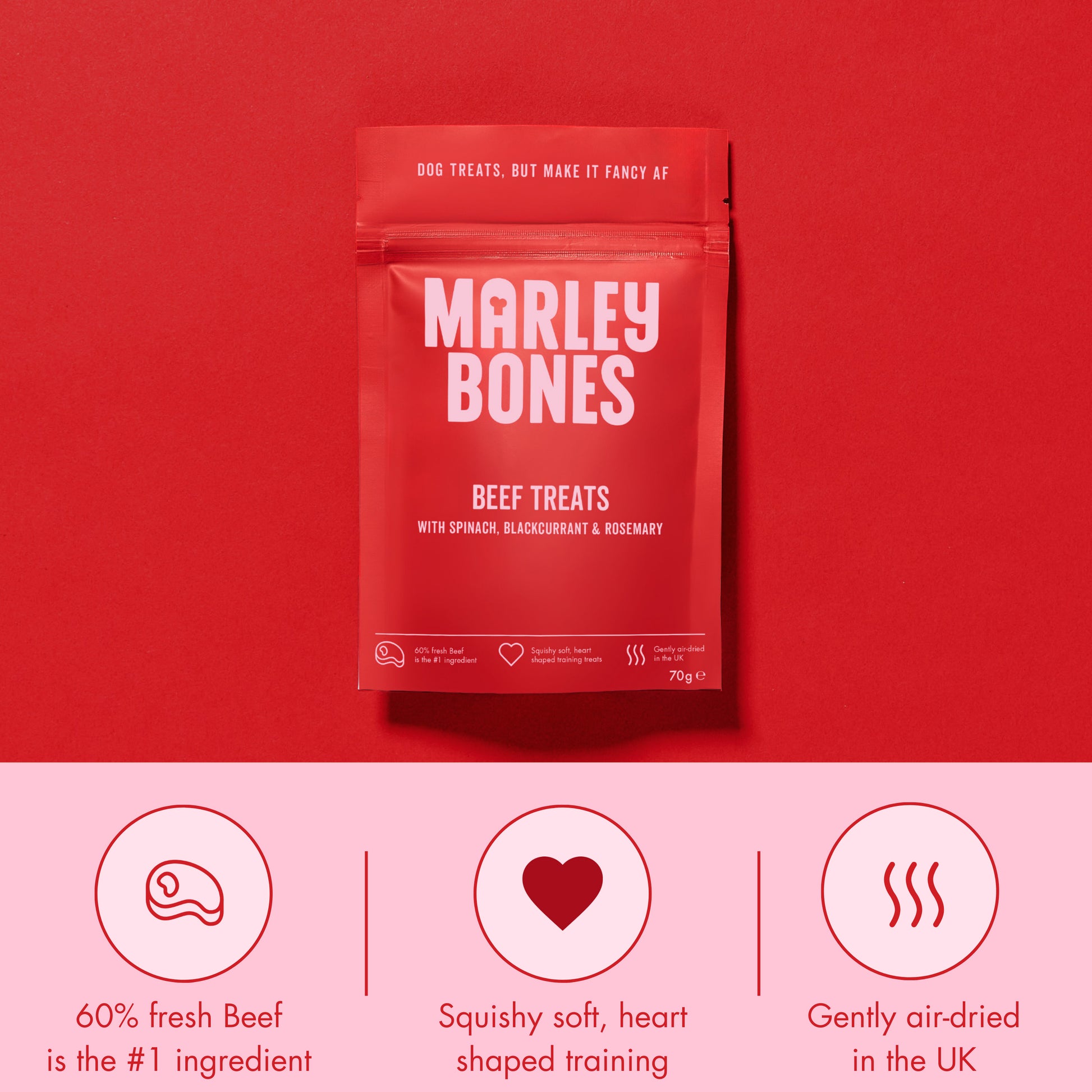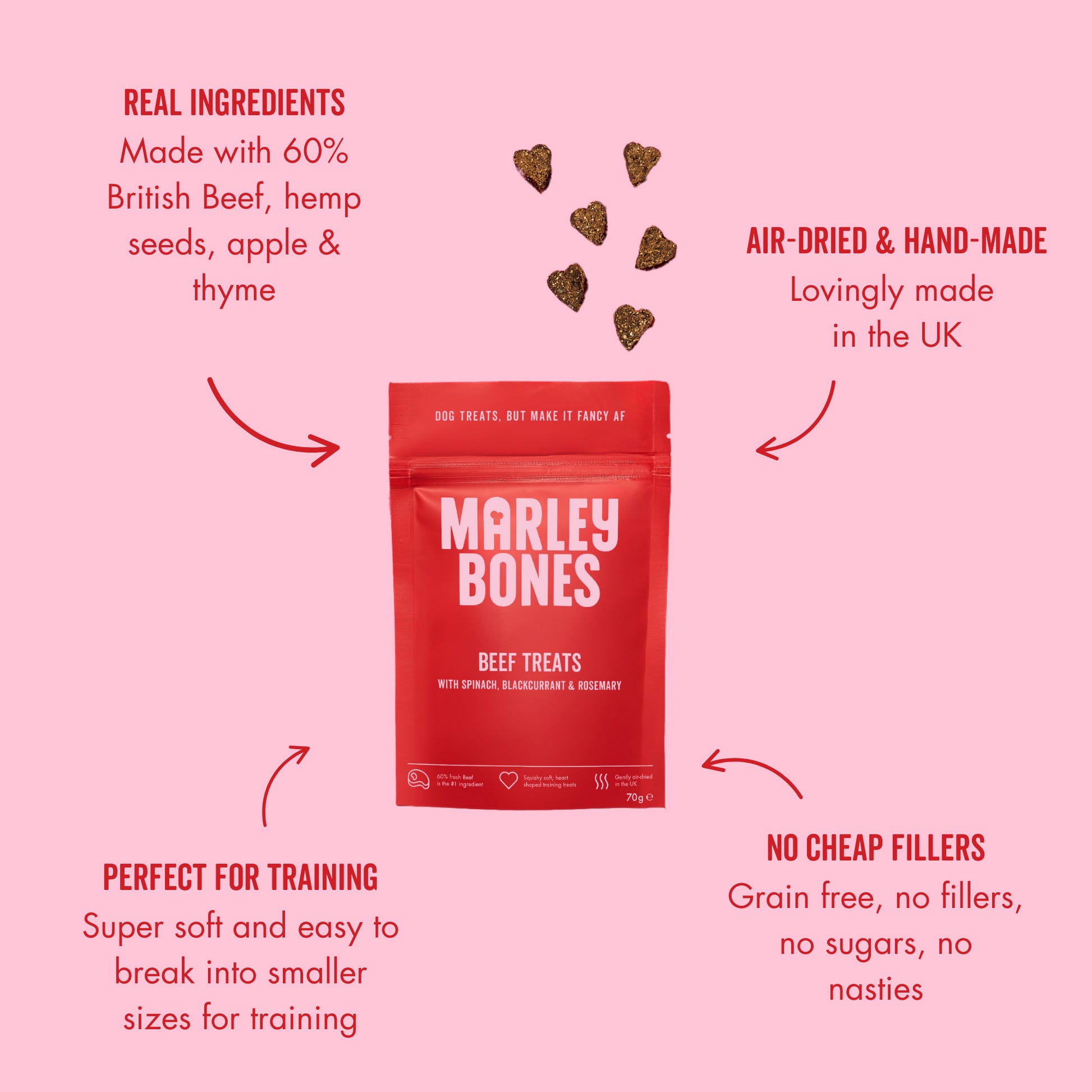 Spoil your furry bestie with Marleybones' Fancy Beef, Blackcurrant, Spinach & Rosemary treats, specially crafted for those special moments. Hand-made with love in the UK, the treats are gently air-dried to preserve their nutritional value and irresistible taste. Free from nasties and fillers, these treats are suitable for dogs of all ages, making them perfect for both puppies and adults. Their squishy soft texture makes them easy to break into smaller pieces for hassle-free training sessions. Treat your dog to a delicious and nutritious treat that they'll love and you'll feel good about. Each treat is lovingly shaped like a heart, adding an extra layer of sweetness to every bite.