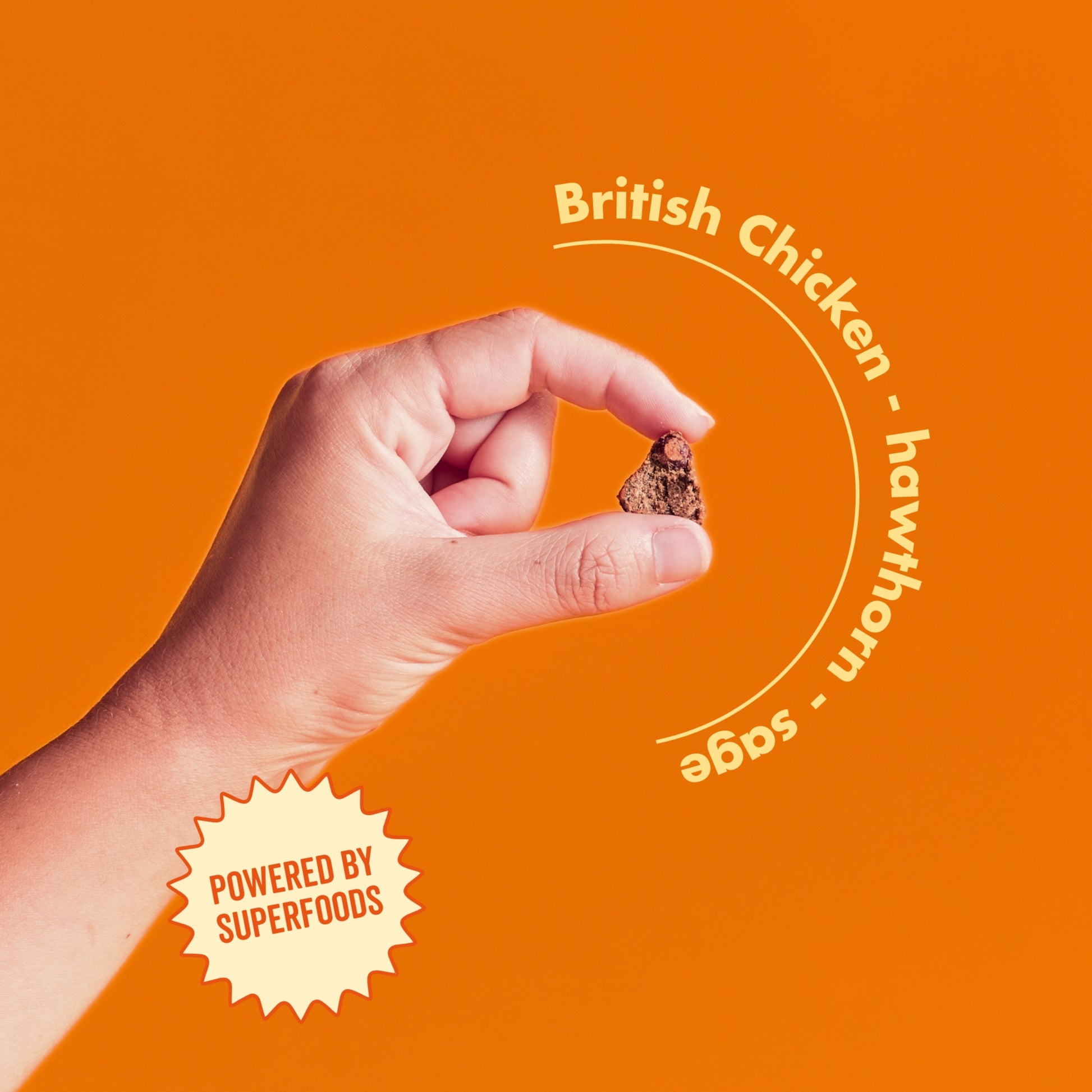 British chicken 60%, sweet potato, rapeseed glycerine, potato, hawthorn berries, carrot, sage.