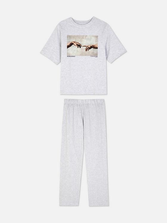 An artistic set of PJs with a T-shirt featuring The Creation of Adam print by Michelangelo and striped pyjama bottoms