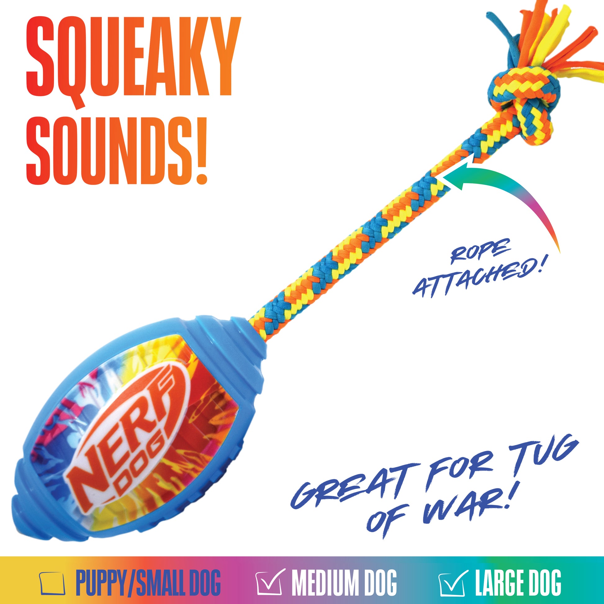 The Nerf Dog Colour Blast Football Tug is perfect for a game of tug of war! It’s made to withstand lots of chewing and tugging. The rope handle is made from a soft, durable T Shirt rope, and helps your dog have a secure grip while they play with you or another friendly pup. This football makes squeak sounds that dogs love!