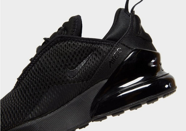 Give them the next level of Air Max with these children's Air Max 270 sneakers from Nike. In a triple-black colourway, they take inspo from the Air Max 180 and 93 for a futuristic look that has heritage style. Made from breathable mesh, these sneaks keep them cool while providing support with synthetic overlays. Sat on a foam midsole with the tallest ever visible Air unit to the heel for maximum cushioning, these creps have a grippy outsole to keep them steppin'. With tonal lacing and a heel pull tab, these sneakers are finished with a black Swoosh to the sidewalls along with Air Max branding to the tongue.