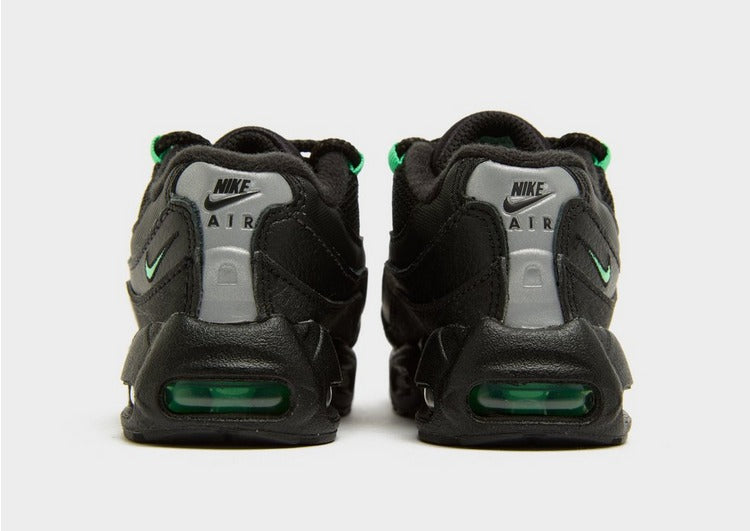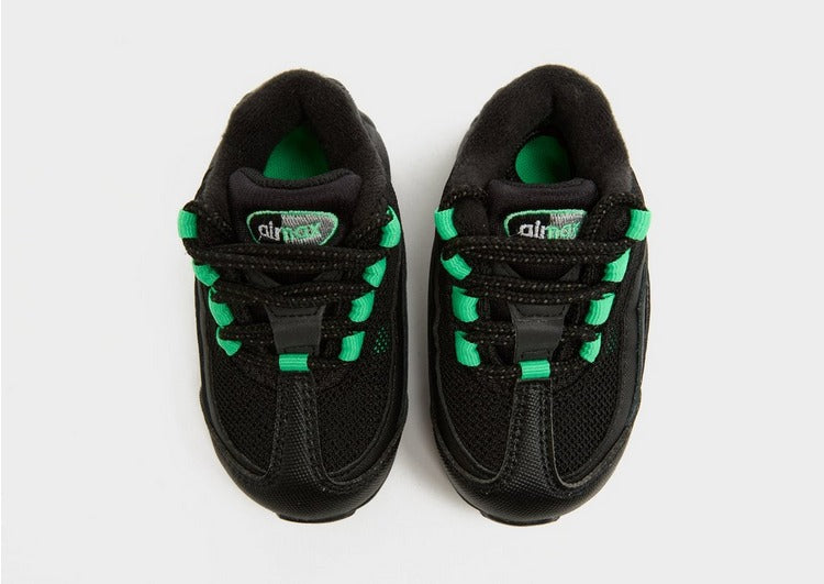 Start their sneaker collection off strong with these infants' Nike Air Max 95 trainers. In a Black colourway with Green Shock details, this downsized pair draws inspiration from the human body. They have a breezy mesh upper with real and synthetic layers for durable wear, and classic laces for a snug secure fit. They sit above a thick foam midsole with visible Max Air cushioning for supreme comfort, with a grippy rubber outsole. Finished with iconic Nike branding throughout.