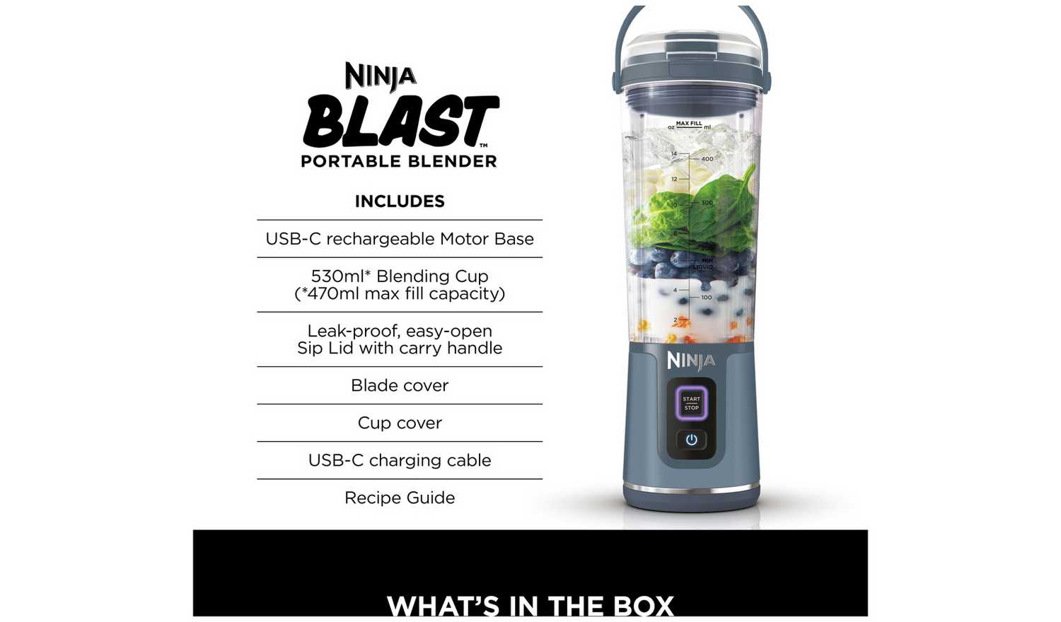 Powerful, high-performance Ninja blending - now totally portable. Easily blend delicious smoothies, protein shakes and frozen drinks anywhere with this USB-C rechargeable cordless blender. Perfect for the gym, a busy day at work, picnics in the park and more – take it anywhere with a leak-proof design, easy-open sip lid, convenient carry handle and safe covers for the blade and cup.