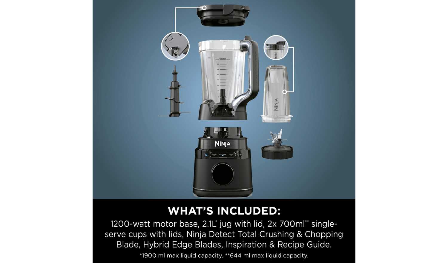 - Accessories included: 2.1L Pitcher (1900ml max liquid capacity), Pitcher Lid with Pour Spout, Ninja Detect Total Crushing & Chopping Blades (Stacked Blade Assembly), 2 x 700ml Single-Serve Cups (644ml max liquid capacity), 2 x Spout Lids, Hybrid Edge Blades Assembly, Inspiration Guide with 10 Recipes.