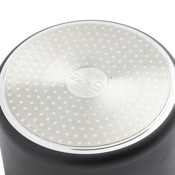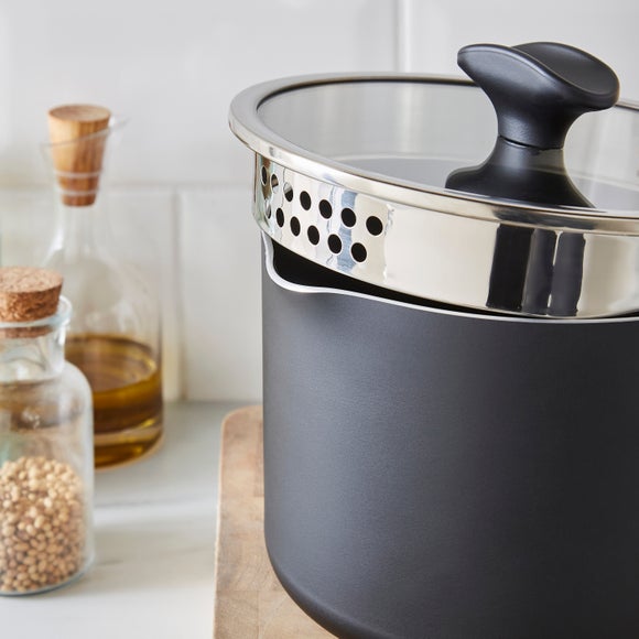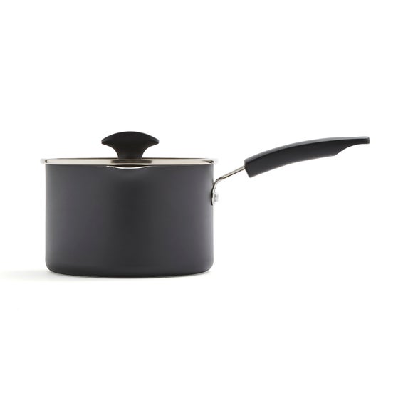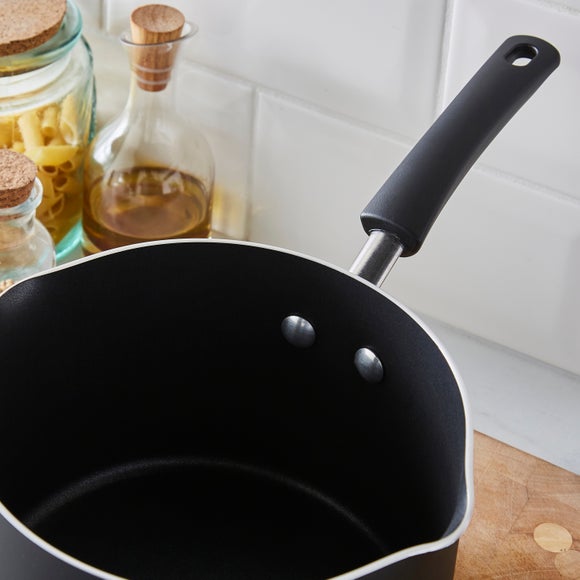 Introducing the Dunelm Aluminium Saucepan, your kitchen's new companion. Its double-sided pouring lips and convenient straining lids make pouring and draining a breeze, adding ease to your cooking experience. The see-through glass lid allows you to lock in flavours whilst keeping an eye on your cooking. The lid knob doubles as a convenient utensil rest, keeping your kitchen organised and tidy. With an easy-grip, soft-touch handle for comfort, a non-stick interior and exterior for effortless cleaning, and compatibility with all hobs, this saucepan is a must-have for every home chef.