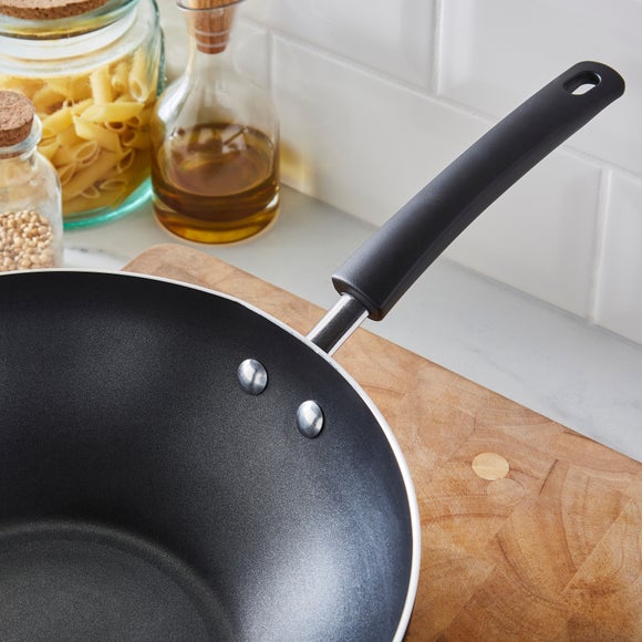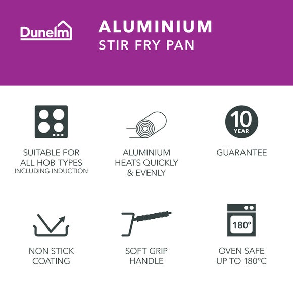 Bring out the chef in you with the Dunelm Aluminium Stir Fry Pan. Its non-stick interior and exterior make stir-frying a joy and clean-up a breeze. The easy-grip, soft-touch handle offers comfort and convenience whilst cooking up your favourite dishes. Compatible with all hobs and dishwasher-safe, this stir fry pan is a kitchen essential you'll love to use again and again.