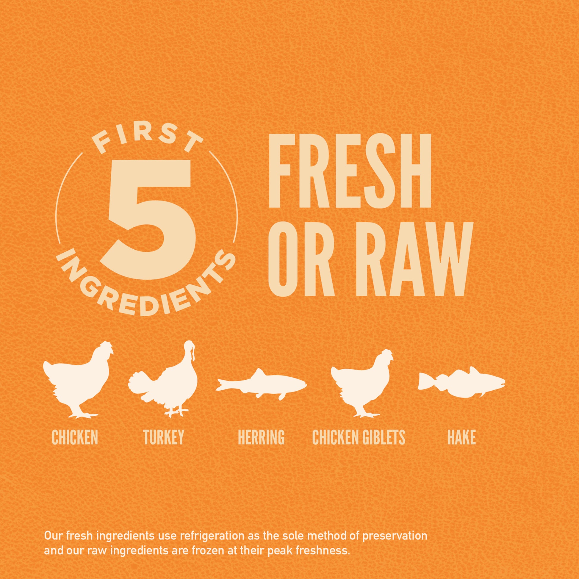 - FRESH & RAW INGREDIENTS* - The first 5 ingredients are fresh or raw* poultry and fish ingredients. *Our fresh ingredients use refrigeration as the sole method of preservation & our raw ingredients are frozen at the peak of freshness to preserve nutrients