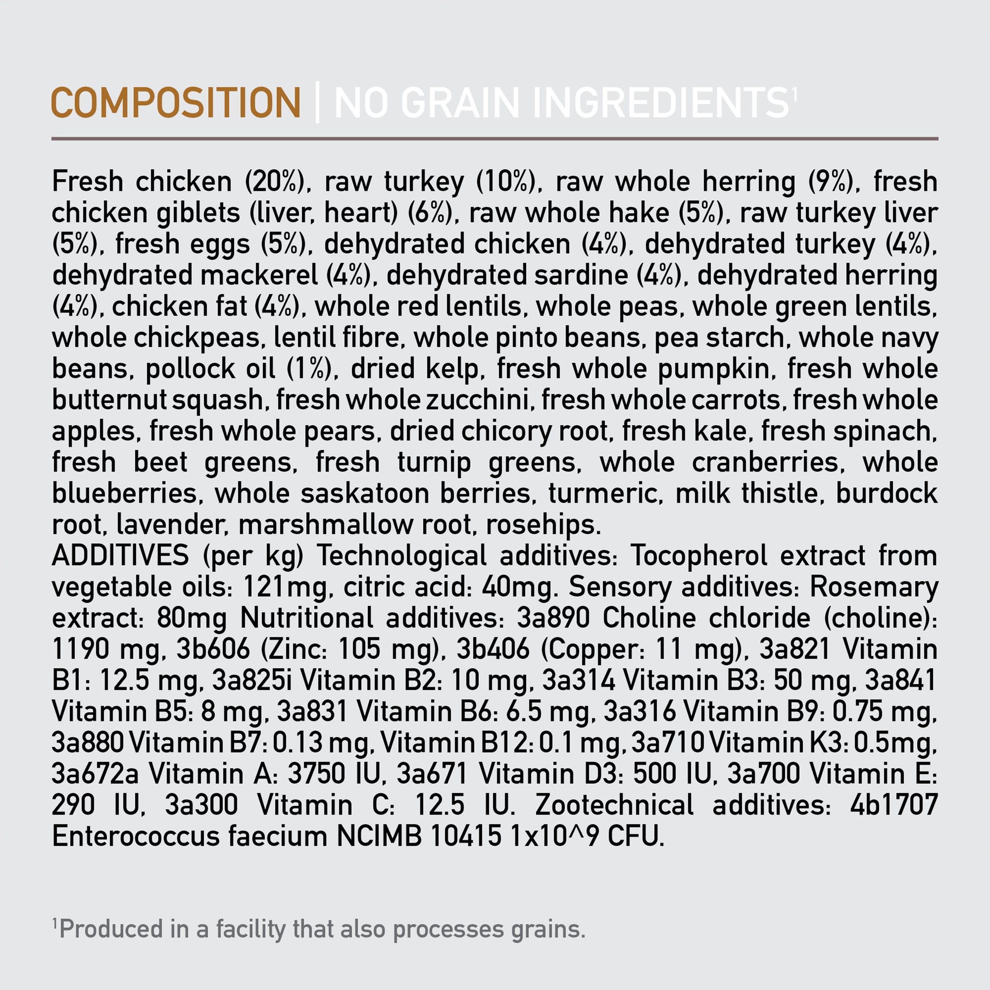 Fresh chicken (20%), raw turkey (10%), raw whole herring (9%), fresh chicken giblets (liver, heart) (6%), raw whole hake (5%), raw turkey liver (5%), fresh eggs (5%), dehydrated chicken (4%), dehydrated turkey (4%), dehydrated mackerel (4%), dehydrated sardine (4%), dehydrated herring (4%), chicken fat (4%), whole red lentils, whole peas, whole green lentils, whole chickpeas, lentil fibre, whole pinto beans, pea starch, whole navy beans, pollock oil (1%), dried kelp, fresh whole pumpkin, fresh whole butternut squash, fresh whole zucchini, fresh whole carrots, fresh whole apples, fresh whole pears, dried chicory root, fresh kale, fresh spinach, fresh beet greens, fresh turnip greens, whole cranberries, whole blueberries, whole saskatoon berries, turmeric, milk thistle, burdock root, lavender, marshmallow root, rosehips.