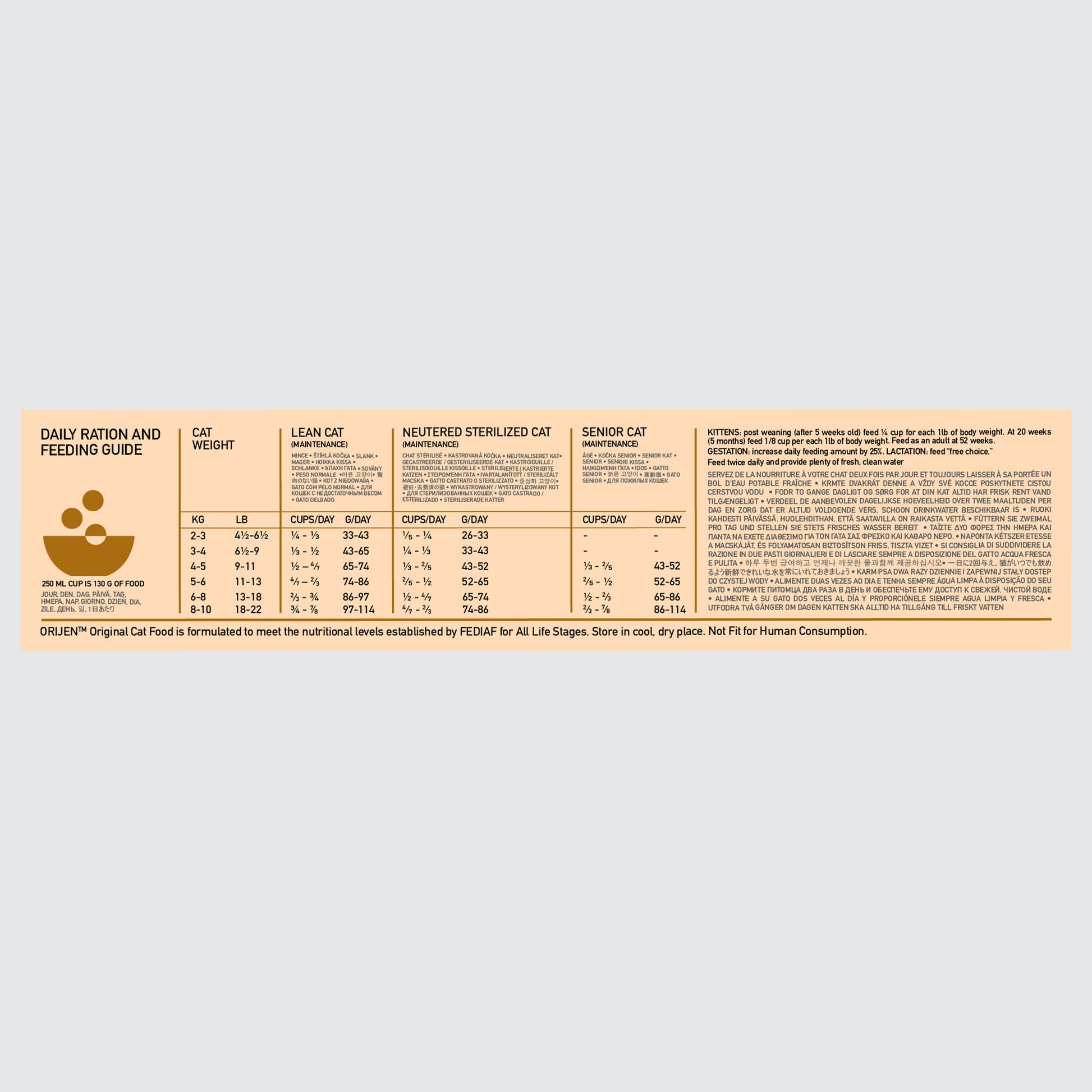 ORIJEN Original Cat diet is made with fresh or raw* chicken, turkey and wild-caught fish. Packed with WholePrey animal ingredients like poultry, fish, organs and bone, ORIJEN Original Cat diet is made with the most nutrient-dense, succulent parts of the prey to deliver the nutrition cats need. With 85%** quality animal ingredients and a freeze-dried liver coating, this diet is beyond comparison.