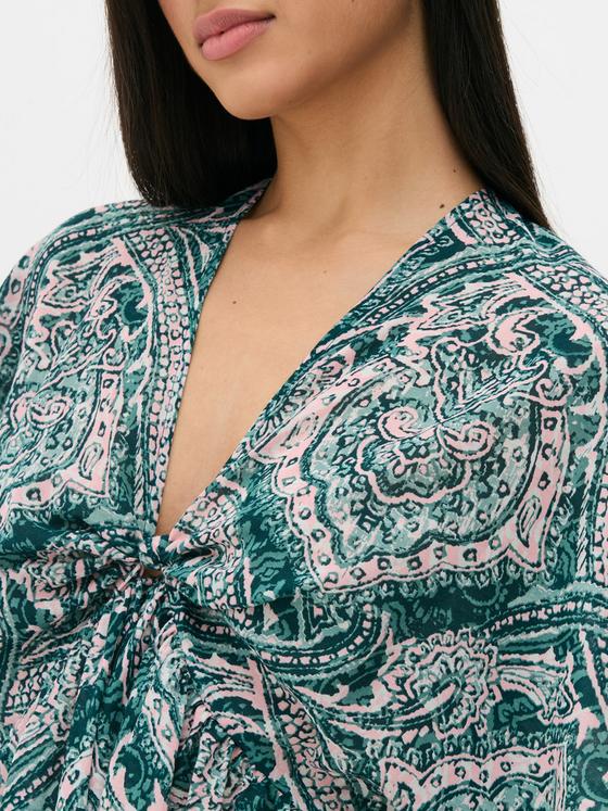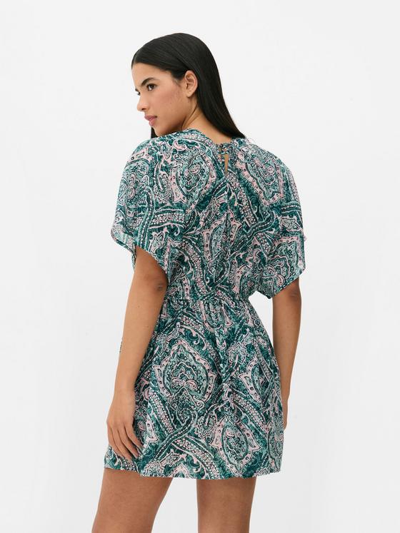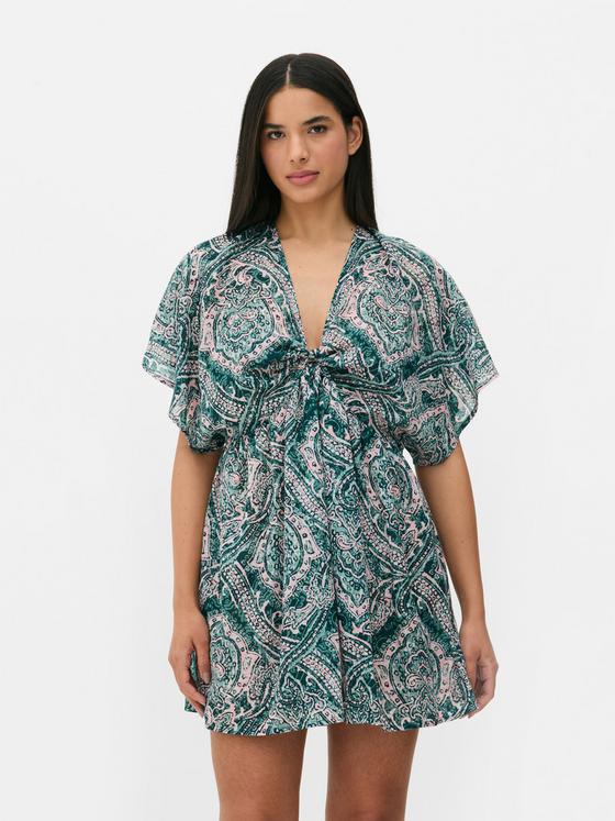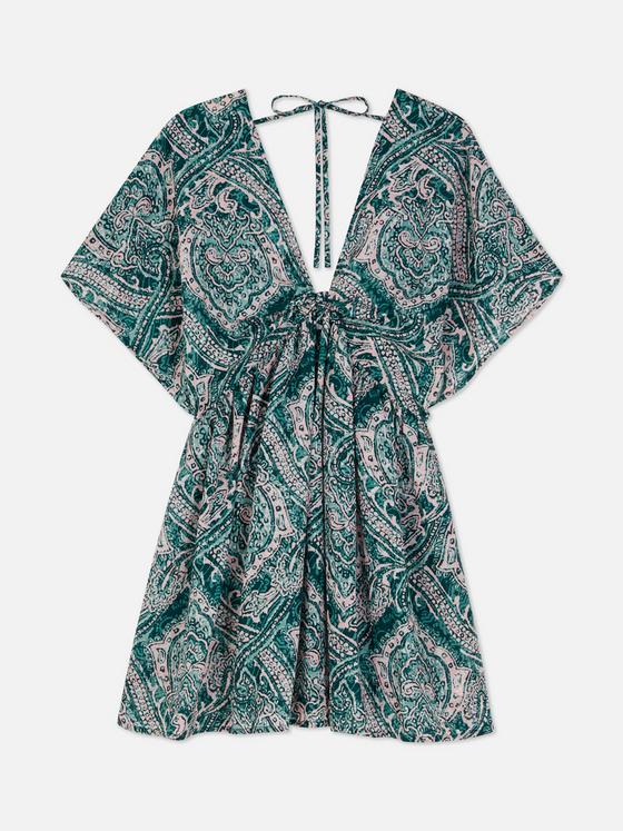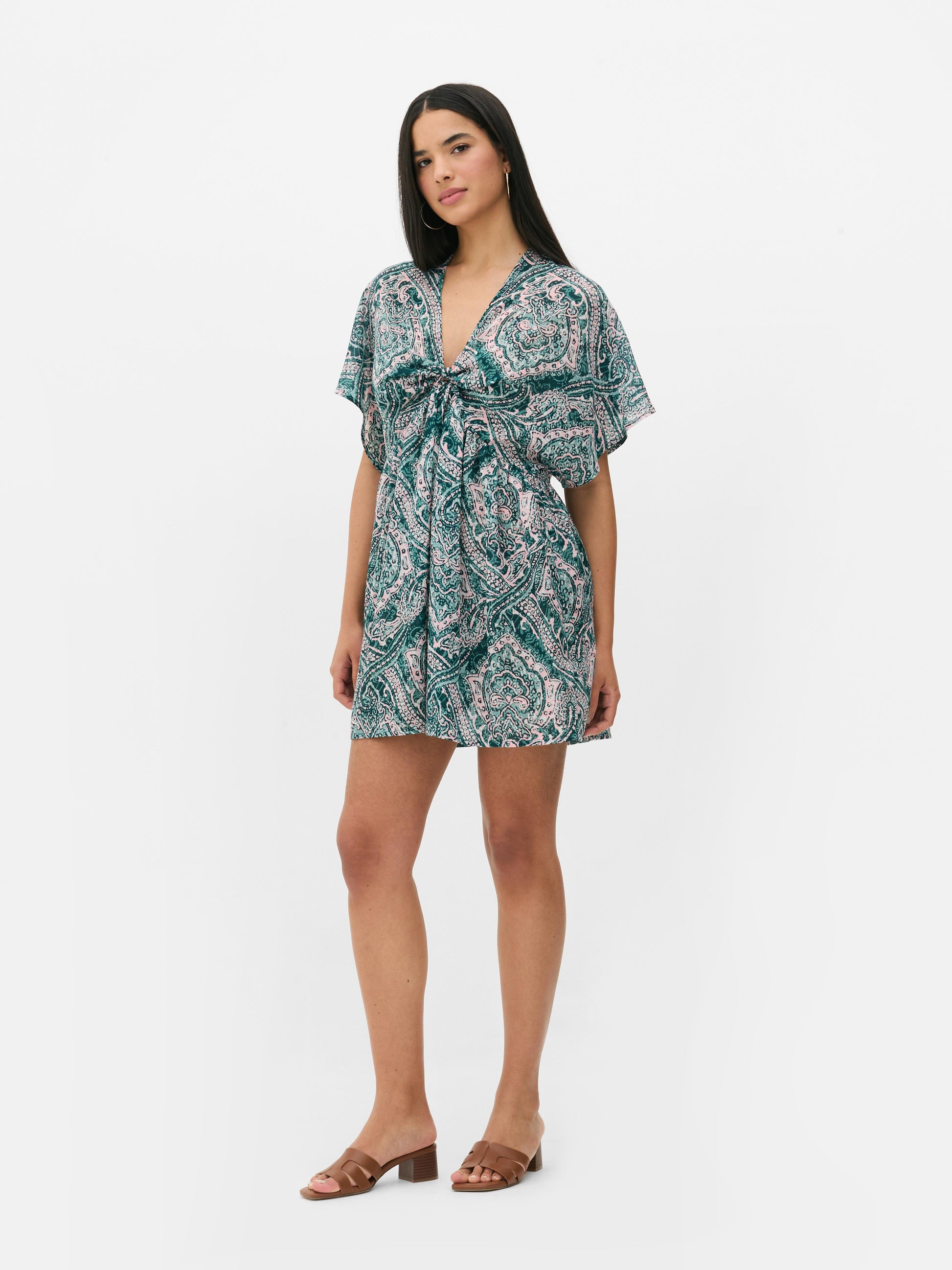 This beach kaftan features a paisley pattern with a V-neck, gathered waistline and tie back fastenings