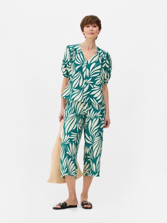 A v-neck blouse with short sleeves and all-over pattern