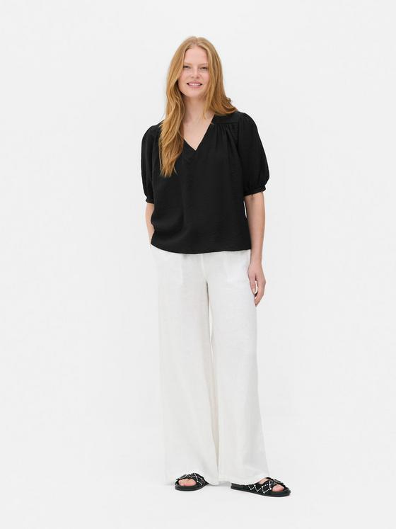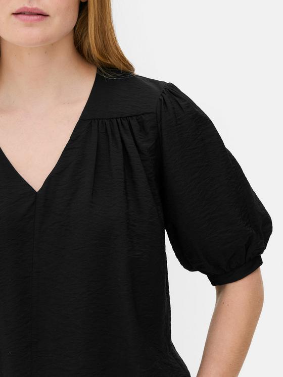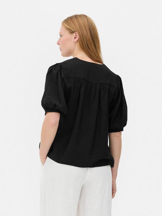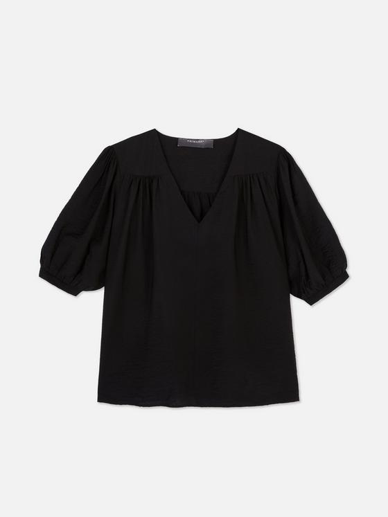 This black blouse is perfect for adding a classic touch to your wardrobe. It features a flattering V-neckline and gathered puff sleeves for a stylish yet relaxed look. Pair it with jeans for an effortless daytime outfit or tuck it into a skirt for a dressier feel.