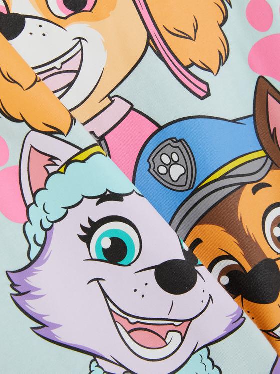 This PAW Patrol sleep T-shirt will have your little one dreaming of adventures with their favourite rescue pups. Made from cotton with cute ruffle sleeves, it features the "PAWFECT pals" slogan and cheerful character prints of Chase, Skye and Everest against a light mint background. Pink paw prints add an extra playful touch that fans of the show will love. Pair with tonal pyjama bottoms for a complete bedtime look, or with leggings for those laid-back weekend mornings when breakfast and cartoons are the only items on the agenda. Perfect for PAW Patrol fans who want to take their favourite characters along on every bedtime adventure!