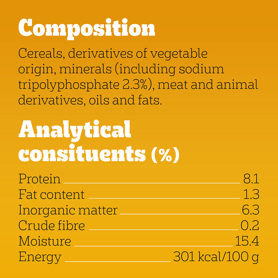 Cereals, Derivatives of Vegetable Origin, Minerals (including Sodium Tripolyphosphate 2.3%), Meat and Animal Derivatives, Oils and Fats
