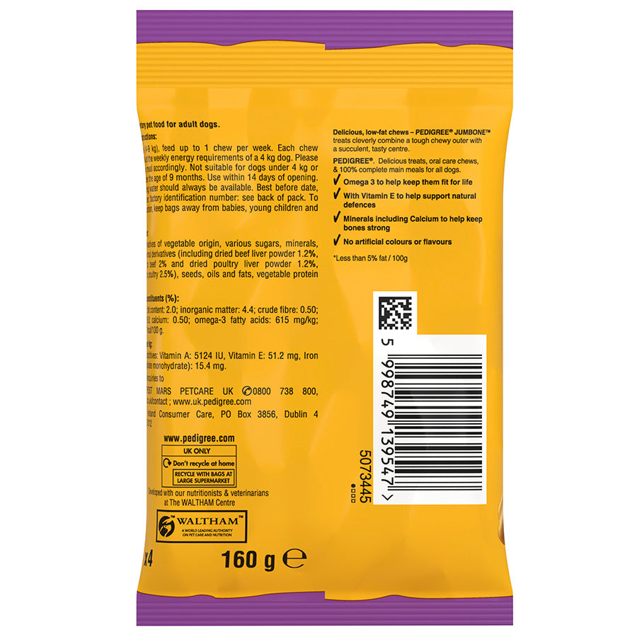 Delicious, low-fat dog treat chews - PEDIGREE JUMBONE treats cleverly combine a tough chewy outer with a succulent, tasty centre. Made especially for small breed dogs between 4-14kg , these chewy dog treats contain less than 5% fat / 100g and are full of goodness such as omega 3 to help keep them fit for life, vitamin E to help support natural defences, with minerals including calcium to help keep bones strong and with no artificial colours or flavours.
