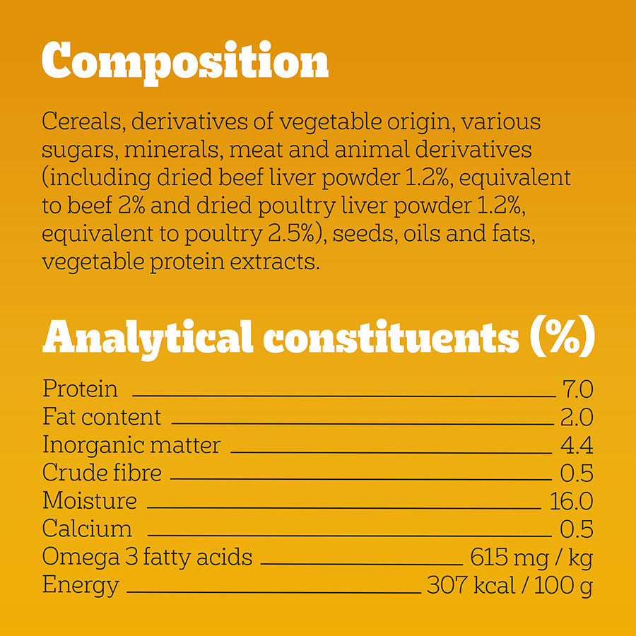 Cereals, Derivatives of Vegetable Origin, Various Sugars, Minerals, Meat and Animal Derivatives (including Dried Beef Liver Powder 1.3%, equivalent to Beef 2.2% and Dried Poultry Liver Powder 1.1%, equivalent to Poultry 2.5%), Seeds, Vegetable Protein Extracts, Oils and Fats