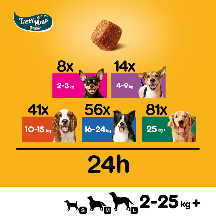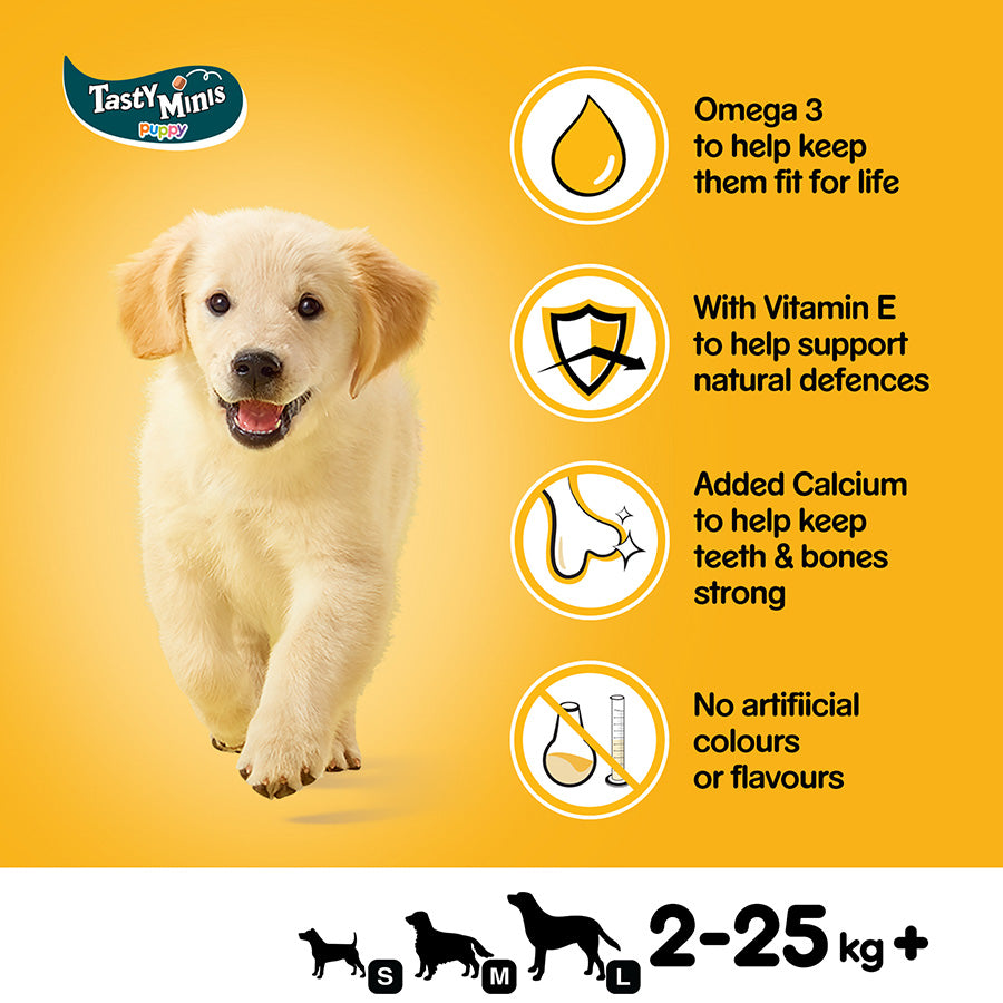 Delicious, soft and chewy, Pedigree Tasty Minis Puppy are scrumptiously tasty little dog treats for puppies. Designed for smaller mouths, these Tasty Bites Chewy Cubes are the perfect way to treat, reward or train puppies.