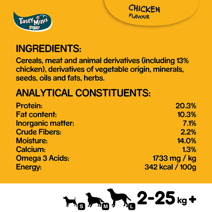 Pedigree Tasty Minis Puppy treats contain added calcium to support the development of strong teeth and bones. These small bites Pedigree puppy treats, with added dietary fibre, promote healthy digestion, supporting puppies' tummies too, plus there's Omega 3 to help keep them fit for life and vitamins and minerals to help maintain natural defences and vitality. What's more, they have no artificial colours or flavours.