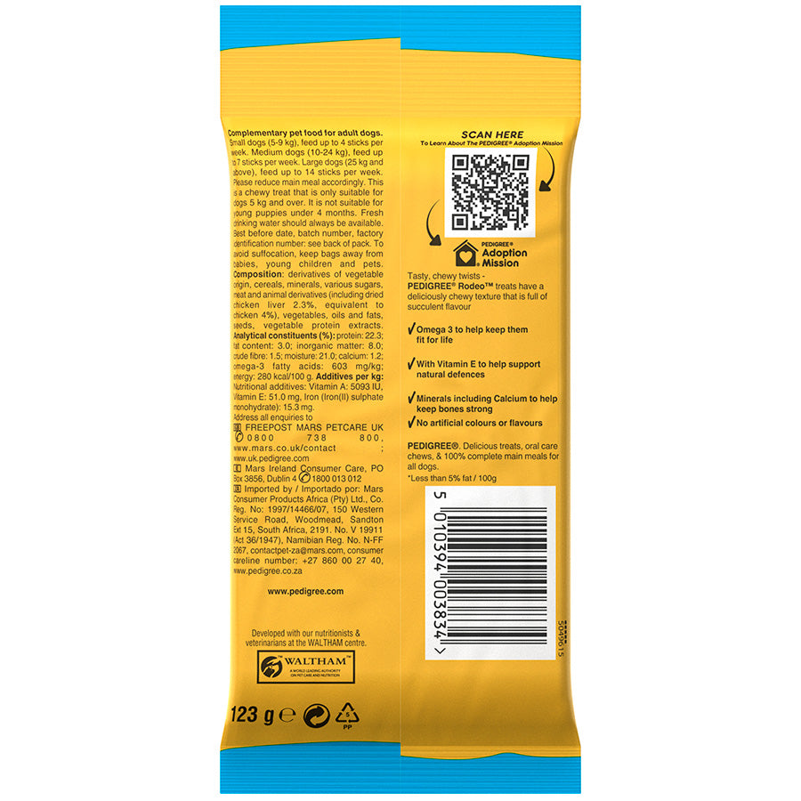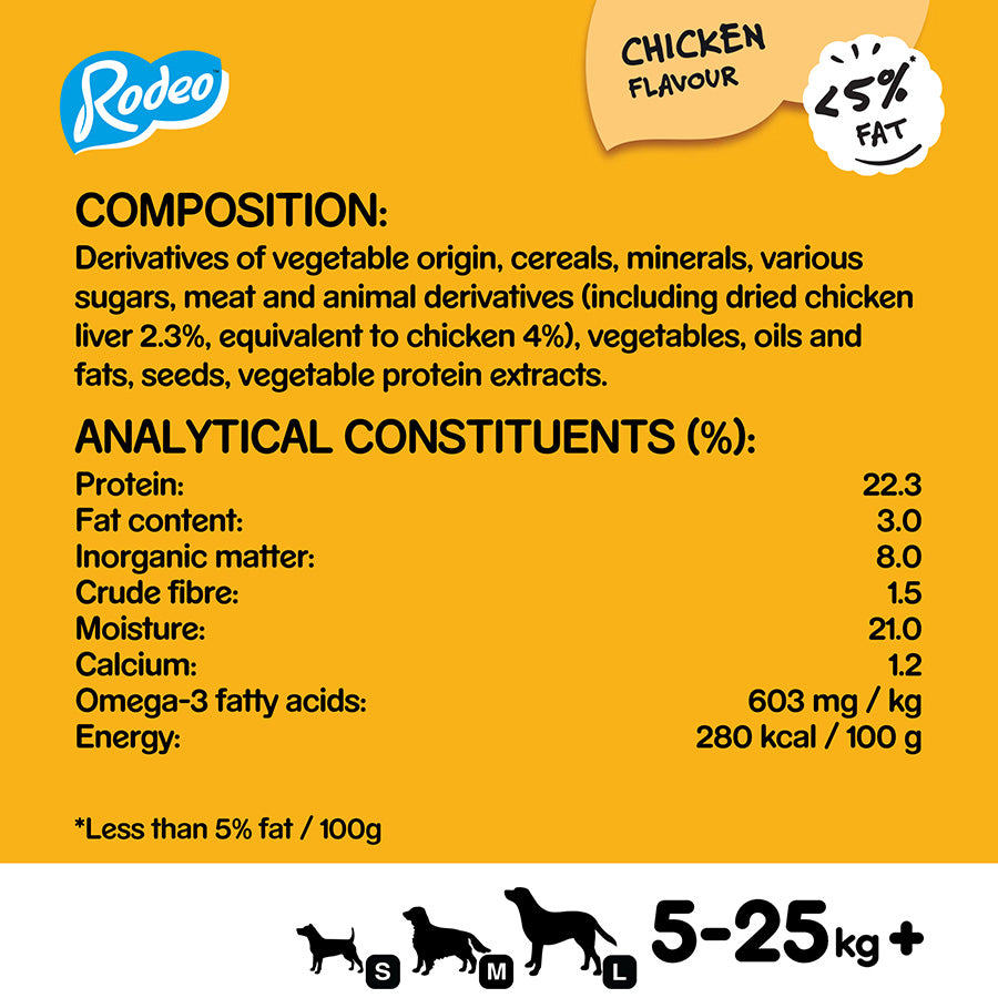 Pedigree Rodeo Dog Treats with Beef are chewy dog treats full of delicious flavours which your dog will adore. Contains less than 5% fat / 100g and are full of goodness such as with omega 3 to help keep them fit for life, vitamin E to help support natural defences, with minerals including calcium to help keep bones strong.