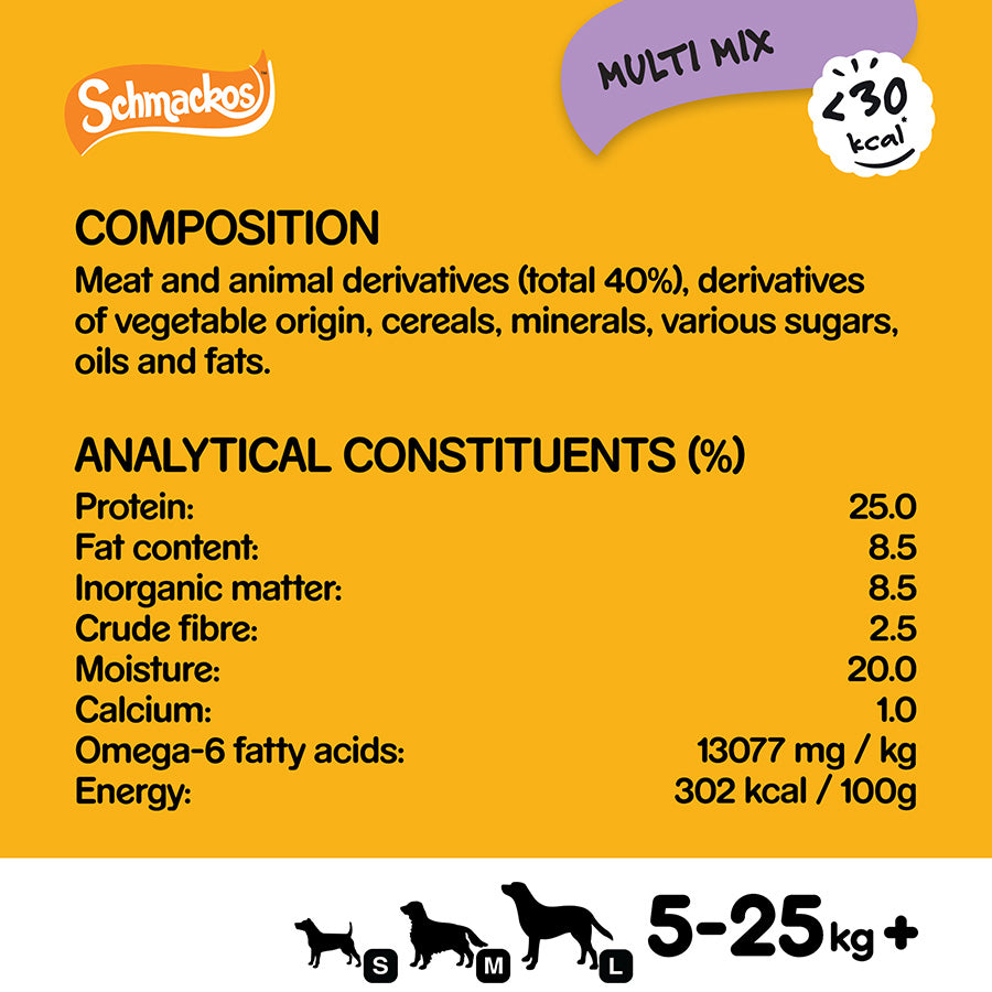Delicious Tender Strips Pedigree Schmackos treats for dogs are soft, succulent treats, full of delicious flavours that dogs adore. 20 tasty dog treat strips in Beef, Lamb and Poultry flavours Dog training treats with Omega 6 to help keep them fit for life. Dog treats for training with Vitamin E to help support natural defences. Treats for dogs with minerals including Calcium to help keep bones strong. Beef dog treats, lamb dog treats, and poultry dog treats with no artificial colours or flavours. Treats for dogs with minerals including Calcium to help keep bones strong.