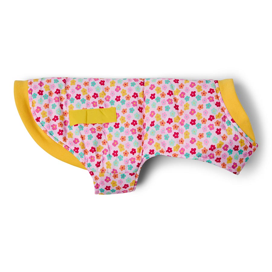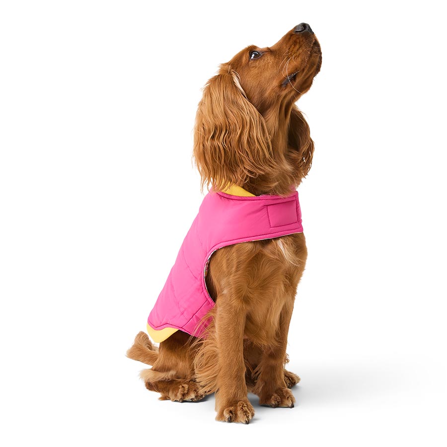 A padded jacket that goes both ways for the ultimate Spring wardrobe makeover. Side one features a cute ditsy floral print with pink, blue and yellow flowers that are as bright as they are cheery. Side two offers a solid pink that strikes a cheerful contrast with the yellow ribbing. Easy-to-wear, thanks to the simple Velcro fastening at the neck and chest, whichever way you wear, the handy harness hole to connect your lead means its perfect to throw on and go.