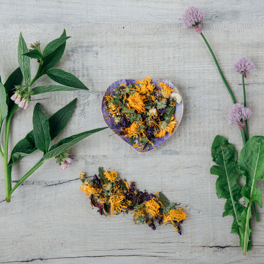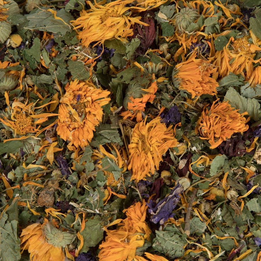 Dried Hibiscus Flower (20%), Dried Marigold Flower (20%), Dried Camomile Flower (20%), Dried Linden Herb (20%), Dried Mallow Flower (10%), Dried Dandelion Flower (10%)