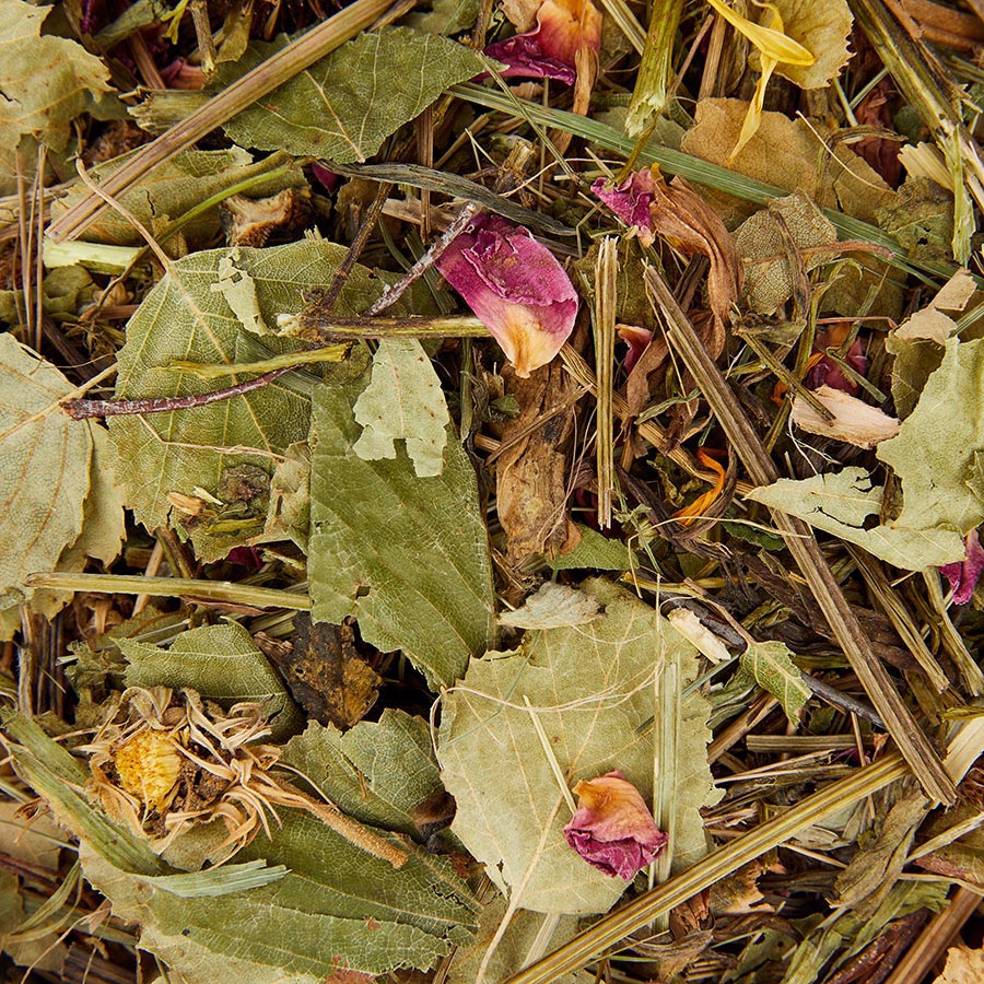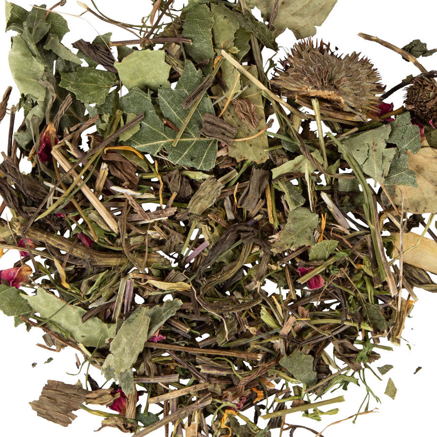 Plantain (20%), Echinacea (15%), Mint (15%) Nettle (15%), Parsley (12%), Willow Bark (7%), Birch Leaf (7%), Rose Hips (3%), Marigold (2%), Rose Petals (2%), Fennel (2%)