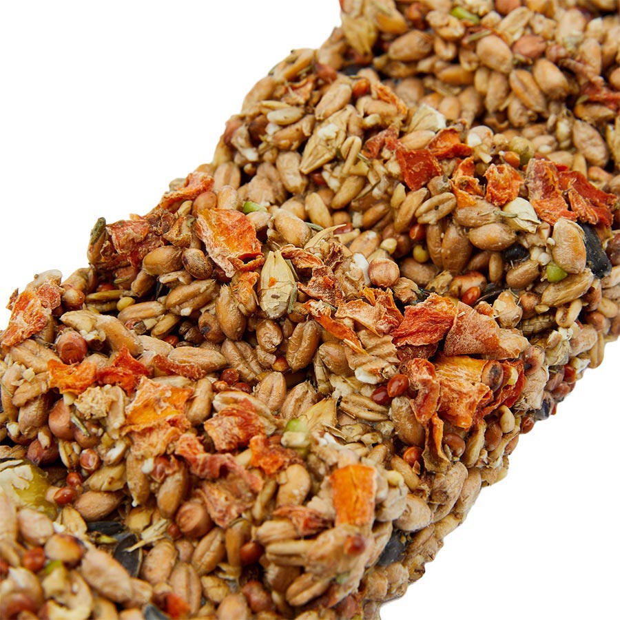 Naked Oats (19%), Red Dari (18%), Micronized Wheat (16%), Micronized Barley (16%), Red Millet (8.%), Peas (7%), Black Sunflower Seeds (6.5%), Rolled Naked Oats (6%), Dried Carrot (2%), Dried Thyme (0.5%), Vegan Binder (1%)