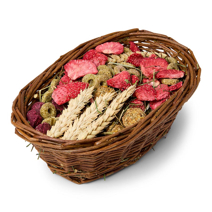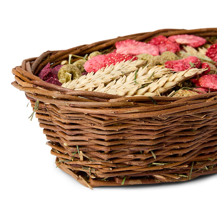 (with willow basket) Willow (23.7%), Meadow Hay, Pea Flakes, Extruded Peas, Ground Corn, Wheat Ears (6.2%), Dried Marigold Blossoms, Dried Strawberries (2.8%), Dried Echinacea, Dried Chamomile (2.8%), Dried Peppermint (2.8%), Alfalfa (1.8%), Dried Beetroot, Vegetable Starch, Vegetable Seed Oil.
