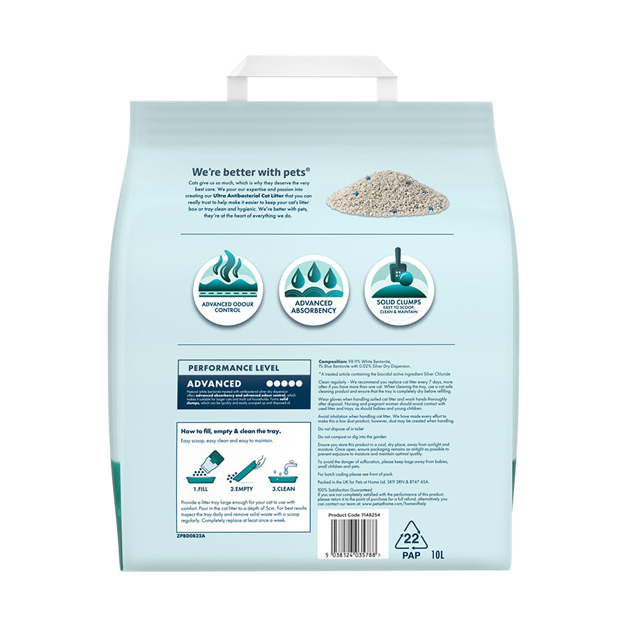 This Pets at Home Ultra Antibacterial Clumping Cat Litter is an Advanced performance litter made from natural white Bentonite and is treated with antibacterial silver dry dispersion offers advanced absorbency and advanced odour control. It also forms solid clumps, making it easier to clean and maintain your cats litter tray. This makes this litter a great option for larger cats and multi cat households.