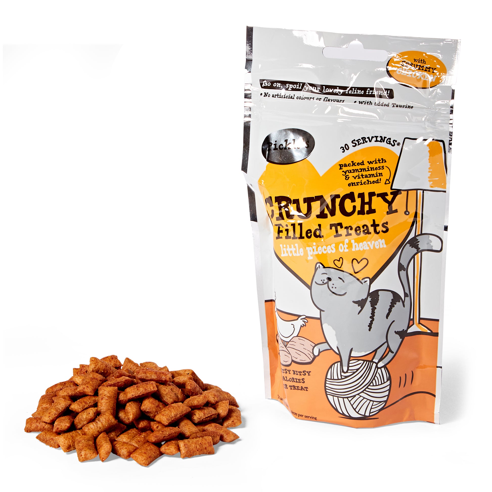 Go on, spoil your lovely feline friend. Pickle's Crunchy Filled Treats with Scrummy Chicken are little pieces of heaven that your cat will be unable to resist. Packed with yumminess and vitamin enriched these irresistible Crunchy Filled Chicken Cat Treats have no added artificial colours or flavours. Whether it's for rewarding good behaviour, or just because, these vitamin enriched small treats have as little as 2 calories per treat. With added Taurine to support normal functioning immune systems for little tummies. Packed in a resealable bag for added convenience, and to stop little paws from opening!