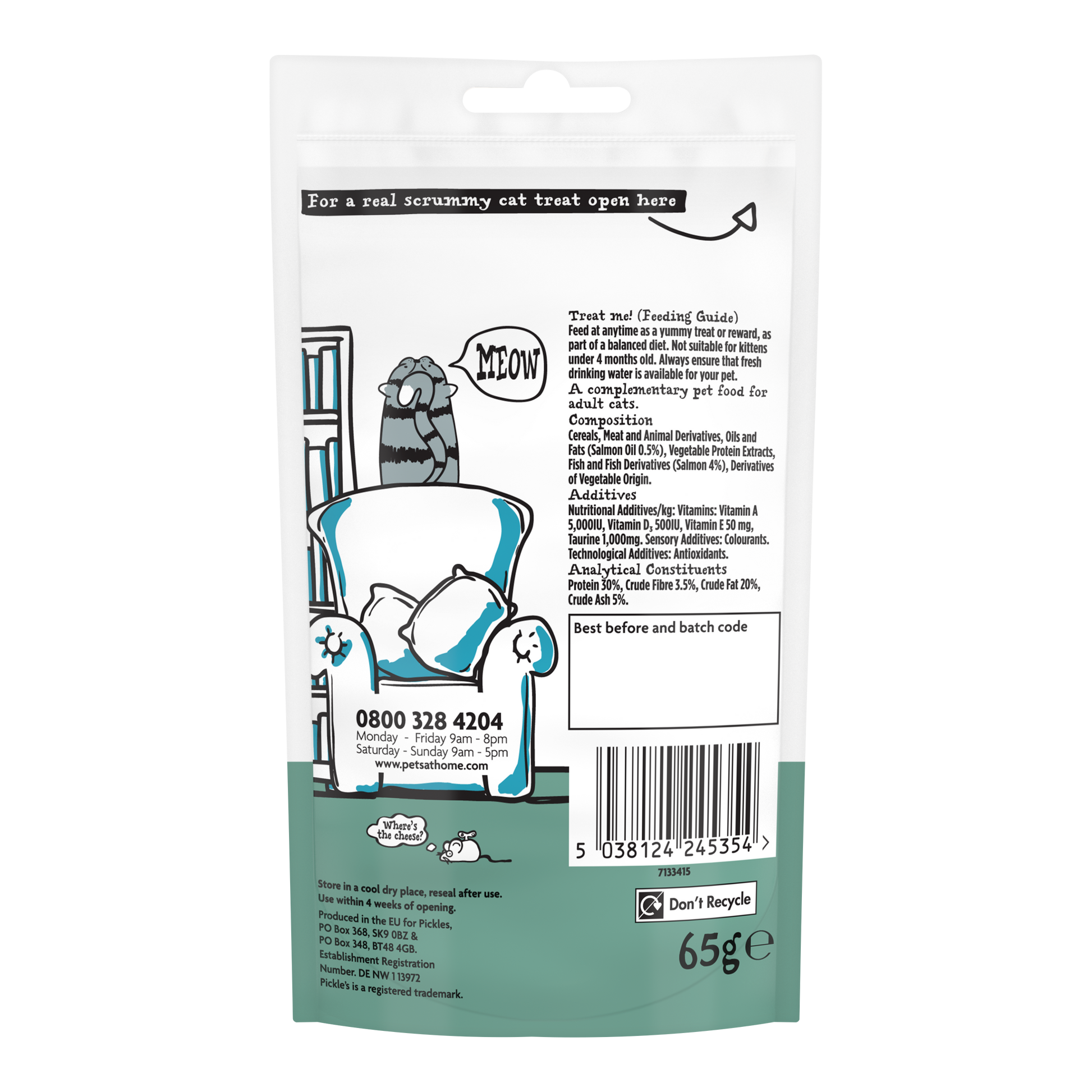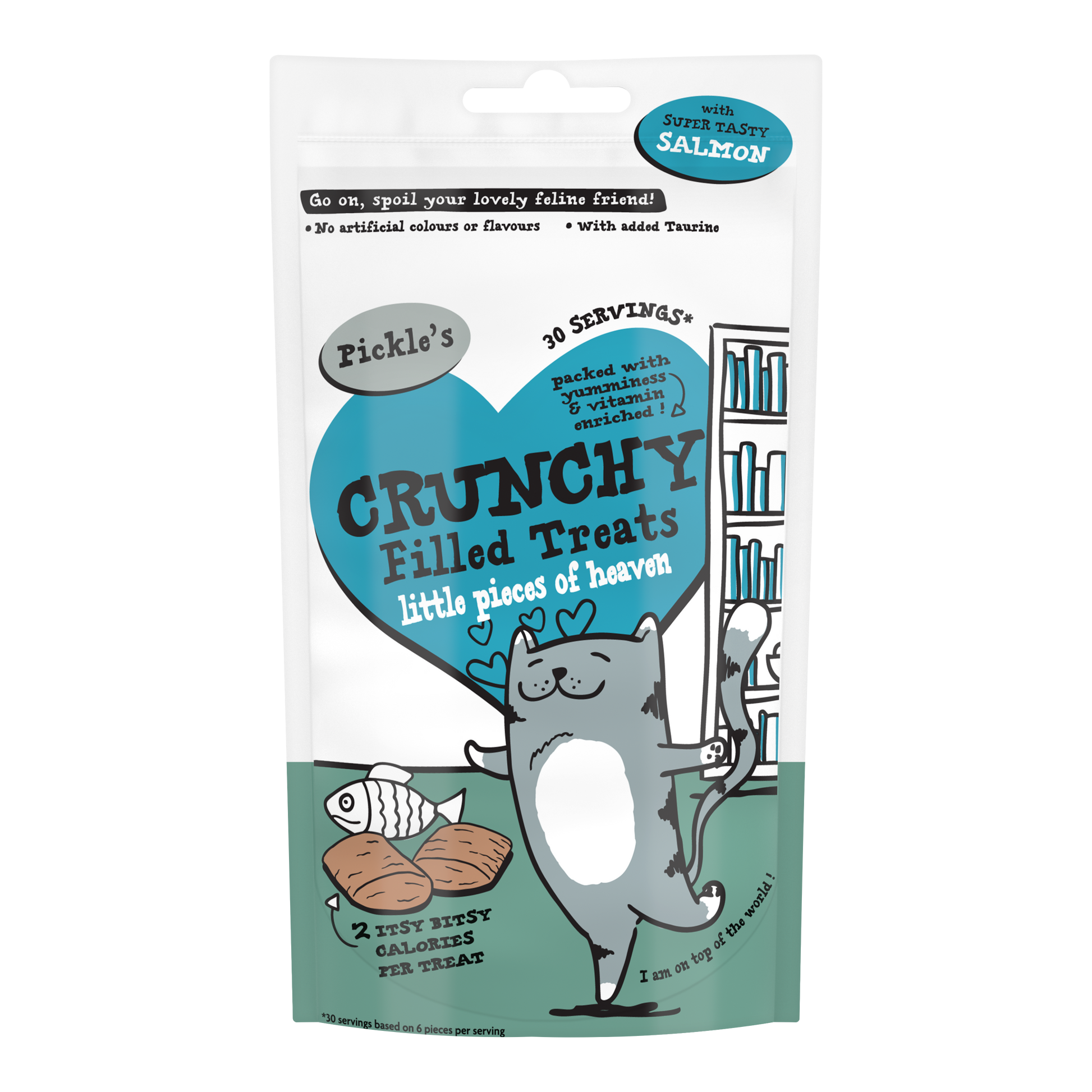 Go on, spoil your lovely feline friend. Pickle's Crunchy Filled Treats with Super Tasty Salmon are little pieces of heaven that your cat will be unable to resist. Packed with yumminess and vitamin enriched these irresistible Crunchy Filled Super Tasty Salmon Cat Treats have no added artificial colours or flavours. Whether it's for rewarding good behaviour, or just because, these vitamin enriched small treats have as little as 2 calories per treat. With added Taurine to support normal functioning immune systems for little tummies. Packed in a resealable bag for added convenience, and to stop little paws from opening!