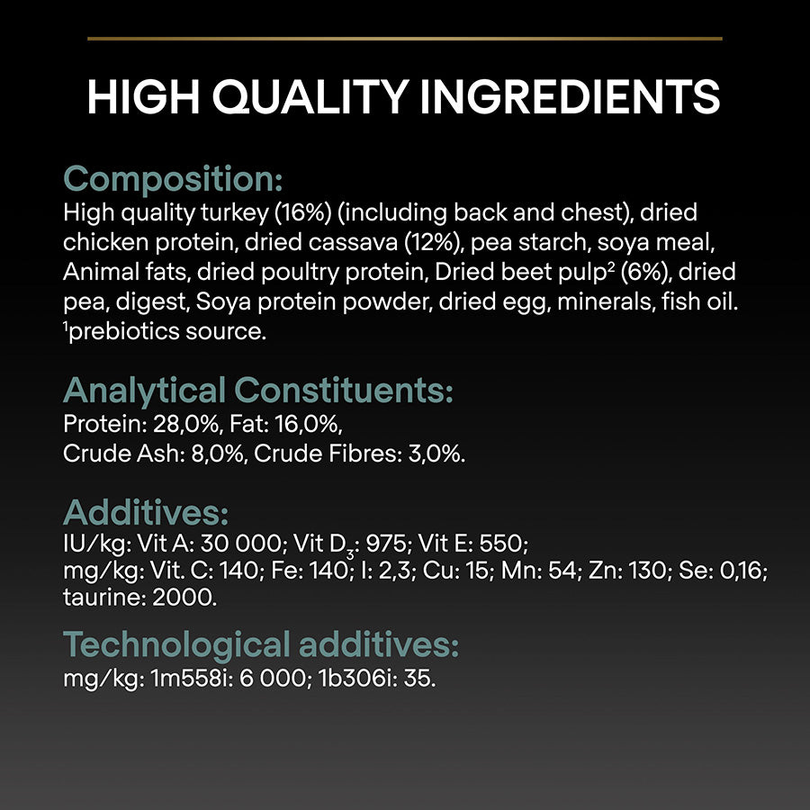 High quality turkey (including back and chest) (16%), dried chicken protein, dried cassava (12%), pea starch, soya meal, animal fats, dried poultry protein, dried beet pulp (6%), dried pea, digest, soya protein powder, dried egg, minerals, fish oil. Prebiotics source