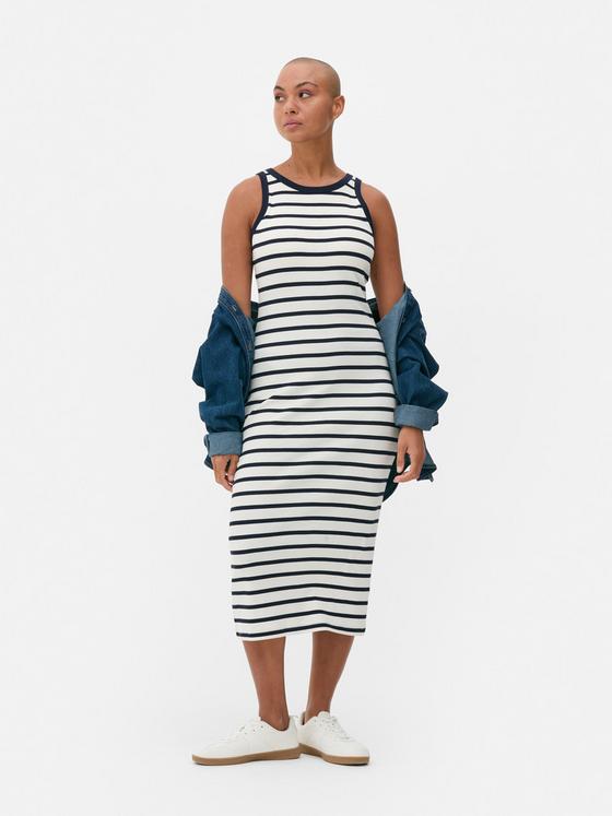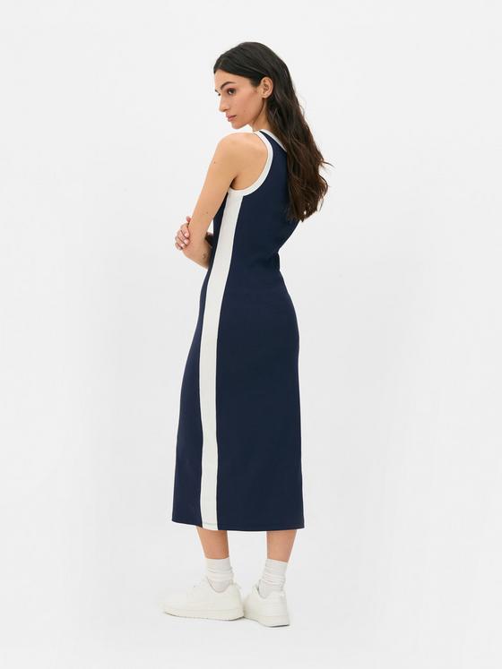 Make a statement in this black midi dress with contrasting white side stripe. The athletic-inspired racerback silhouette creates a flattering line, while the jersey fabric ensures all-day comfort. This wardrobe essential works hard for any occasion, pair with chunky boots and a leather jacket for an edgy weekend look, or style with pointed flats and a blazer for a smart casual office outfit.