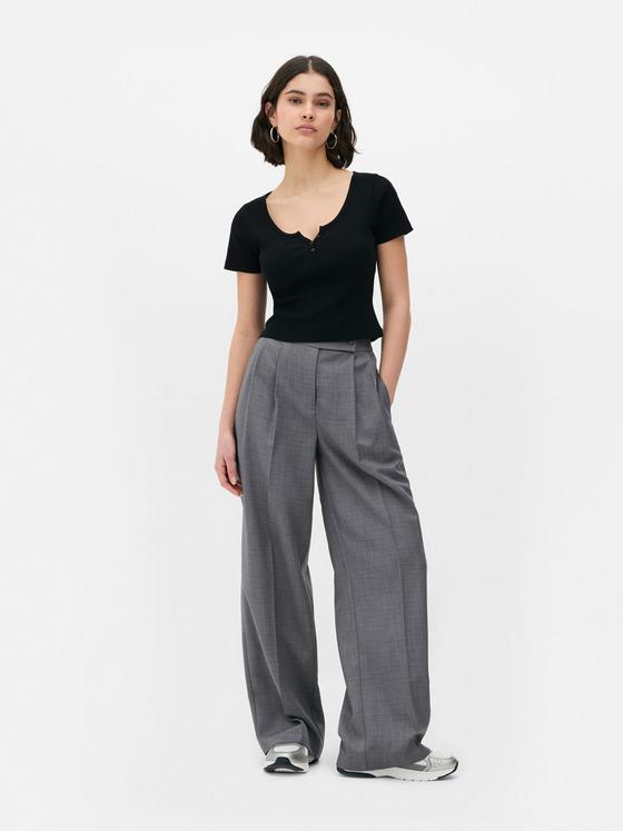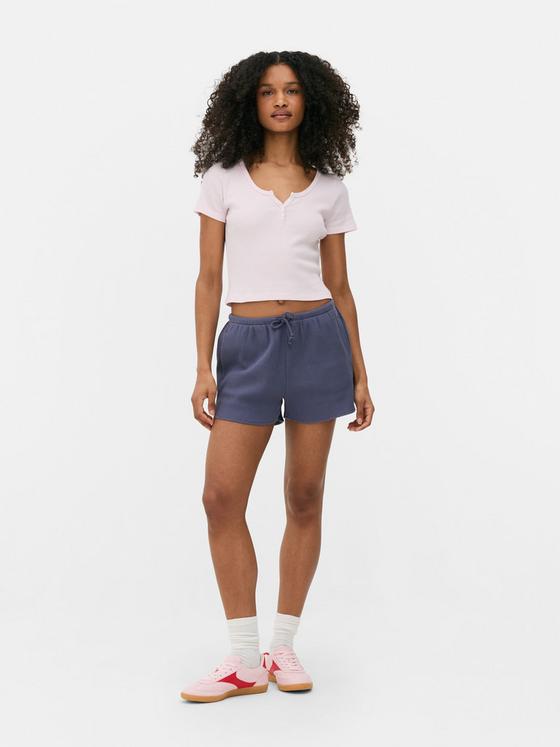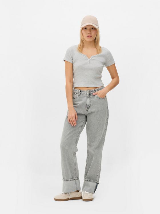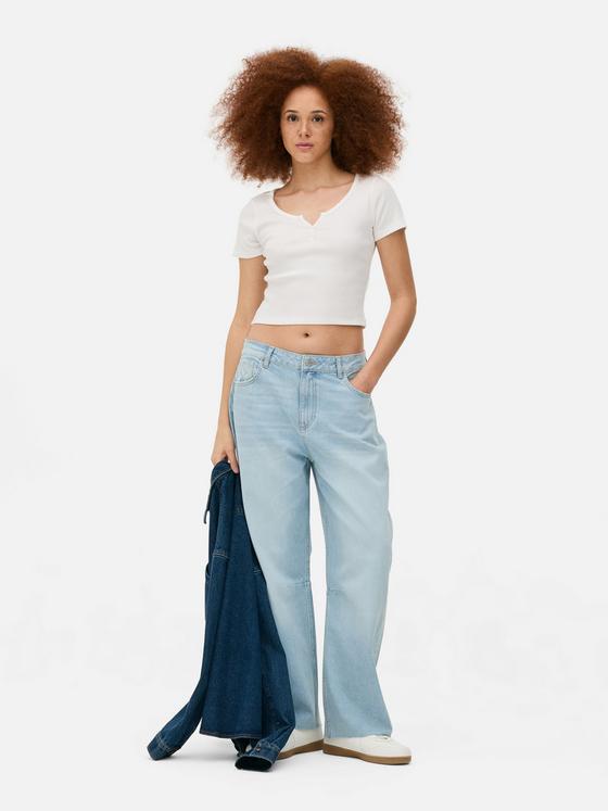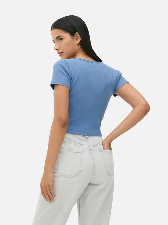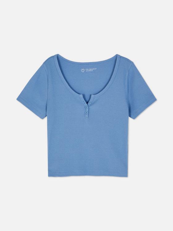 Cool, calm and totally collected: that's the vibe of this blue ribbed Henley T-shirt. The button placket adds a little something extra to the classic short-sleeve design, while the ribbed fabric keeps things interesting. Perfect for those "running out the door" moments, pair it with white jeans for coffee dates or layer under dungarees for weekend adventures. Consider this your new throw-on-and-go essential!