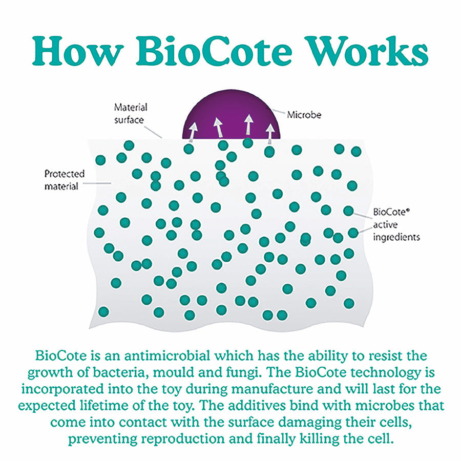 Using the latest technology this germ smart dog toy is BioCote protected. BioCote is an antimicrobial technology which prevents the growth and survival of microbes including bacteria, mould and fungi. Lower levels of bacteria means improved hygiene, reductions in staining and odours and premature degradation of materials. The use of BioCote technology makes this toy more hygienic, keeps it fresher for longer and extends the usable lifetime. The toy also massages gums and helps to reduce plaque and tartar build up as it is constructed out of tough yet soft plastics, is treated with a mint scent and even floats too!