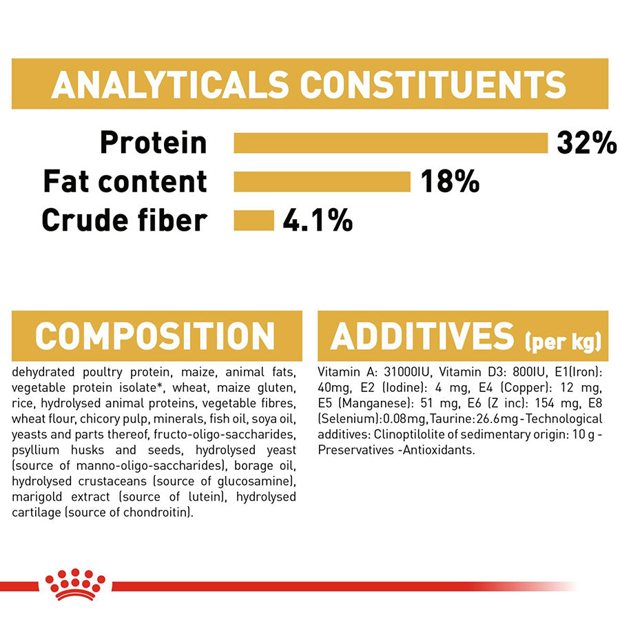 Dehydrated poultry proteins, maize, wheat gluten*, animal fats, wheat, maize gluten, hydrolysed animal proteins, rice, vegetable fibres, wheat flour, chicory pulp, minerals, soya oil, fish oil, yeasts products, fructo-oligosaccharides, psyllium husks and seeds, yeasts (source of Manno-oligosaccharides), borage oil, glucosamine from fermentation, marigold meal, hydrolysed cartilage (source of chondroitin)