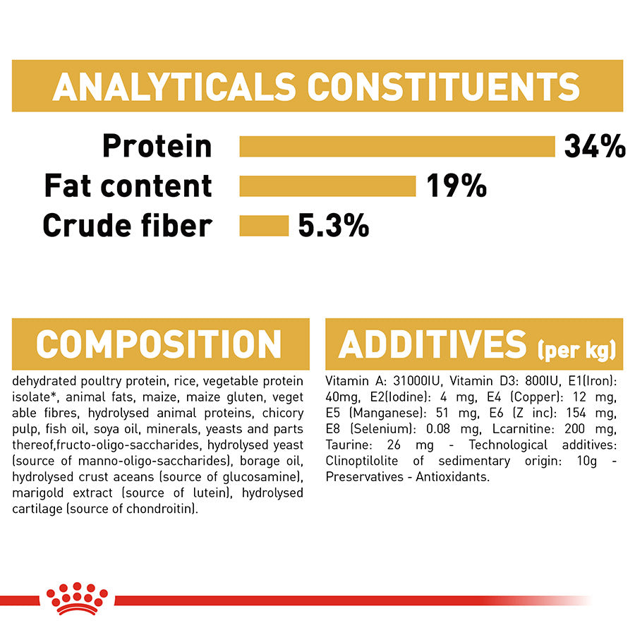dehydrated poultry protein, rice, vegetable protein isolate*, animal fats, maize, maize gluten, vegetable fibres, hydrolysed animal proteins, chicory pulp, fish oil, soya oil, minerals, yeasts and parts thereof, fructo-oligo-saccharides, hydrolysed yeast (source of manno-oligo-saccharides), borage oil, hydrolysed crustaceans (source of glucosamine), marigold extract (source of lutein), hydrolysed cartilage (source of chondroitin)