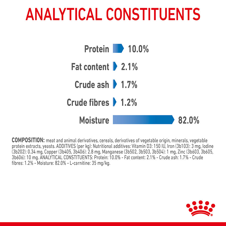Your cats diet plays an important role in their health. The Royal Canin Feline Care Nutrition range includes specially crafted diets formulated to support common sensitivities your cat might encounter. Slightly overweight cats are at increased risk of serious health issues and are less able to enjoy activities. Royal Canin Light Weight Care in Gravy is a nutritionally complete and balanced formula specially designed to help limit weight gain and support healthy weight maintenance. The specially adapted protein content in this formula helps to maintain your cats muscle mass to help keep them at a healthy weight. Royal Canin Light Weight Care in Gravy is also enriched with L-carnitine an amino acid involved in healthy fat metabolism.