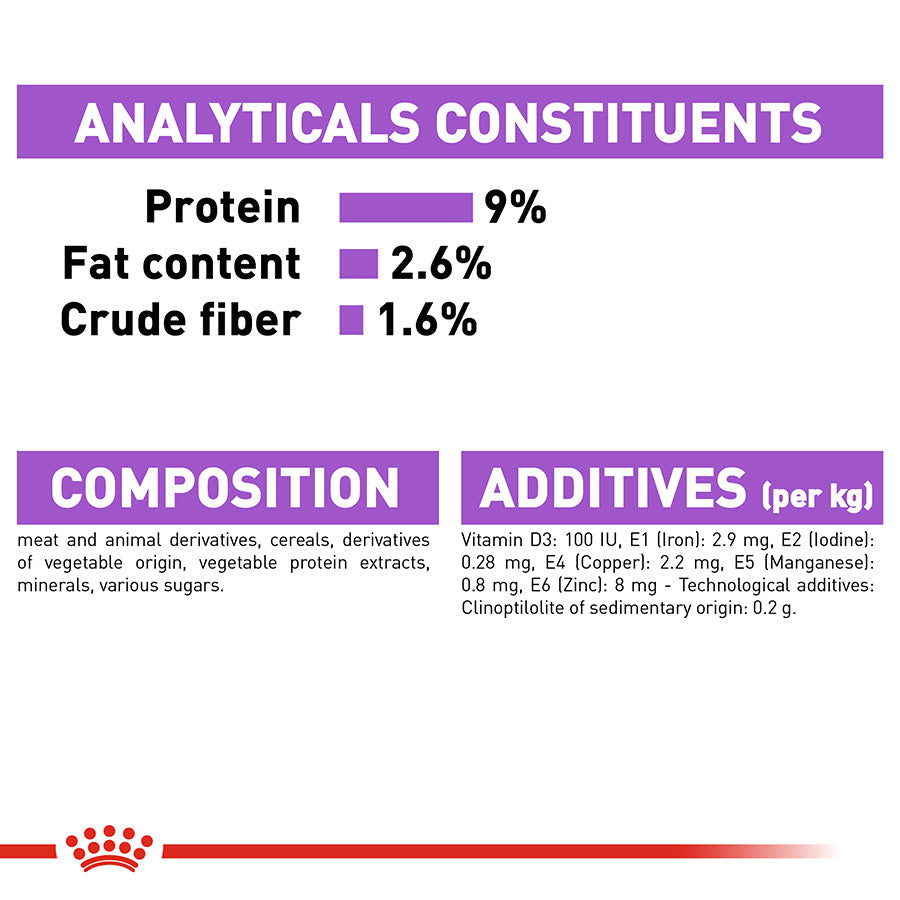 Royal Canin Sterilised in Jelly is formulated to match the optimal nutritional profile instinctively preferred by adult cats. This ensures that your cat will readily consume the nutrients that it needs to maintain good overall health. Royal Canin Sterilised in Jelly also contains a carefully-considered balance of minerals that helps to support the health of your cat's urinary system.