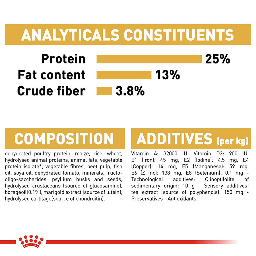 Dehydrated poultry protein, maize, rice, wheat, hydrolysed animal protein, animal fats, vegetable protein, vegetable fibres, beet pulp, fish oil, soya oil, dehydrated tomato, minerals, fructo-oligo-saccharides, psyllium husks and seeds, hydrolysed crustaceans (source of glucosamine), borage oil (0.1%), marigold extract (source of lutein), hydrolysed cartilage (source of chondroitin)