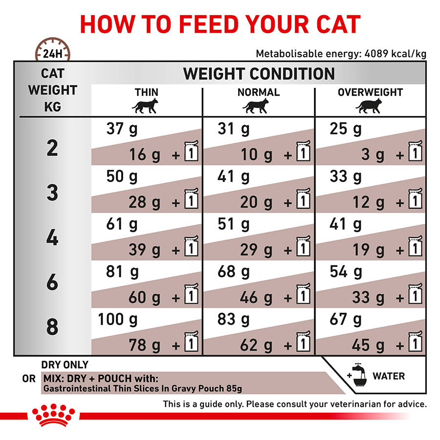 To cater to each cat's individual preferences, Royal Canin Gastrointestinal is also available as wet food in gravy. If you're considering mixed feeding, simply follow the on-pack feeding guidelines to ensure your cat gets an accurate amount of both wet and dry food for optimal benefit. At Royal Canin they're committed to providing nutritional solutions to your pet's needs. All of their products undergo an extensive quality control process in order to guarantee the optimum quality of food, as well as catering to your cat's specific dietary requirements and lifestyle. This means that when your cat eats Royal Canin Gastrointestinal, they are getting a complete and balanced diet.