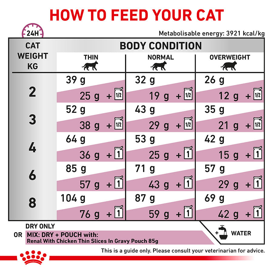 If your cat enjoys a mixed diet of wet and dry food, be sure to reference the on-pack feeding guides to ensure a healthy daily food intake for your cat. Royal Canin Renal Veterinary Diets for cats are formulated to help support kidney function in cats with Chronic Renal Insufficiency. Each formula in the Royal Canin Renal Support range contains specific nutrients to provide your cat with a complete and balanced diet.
