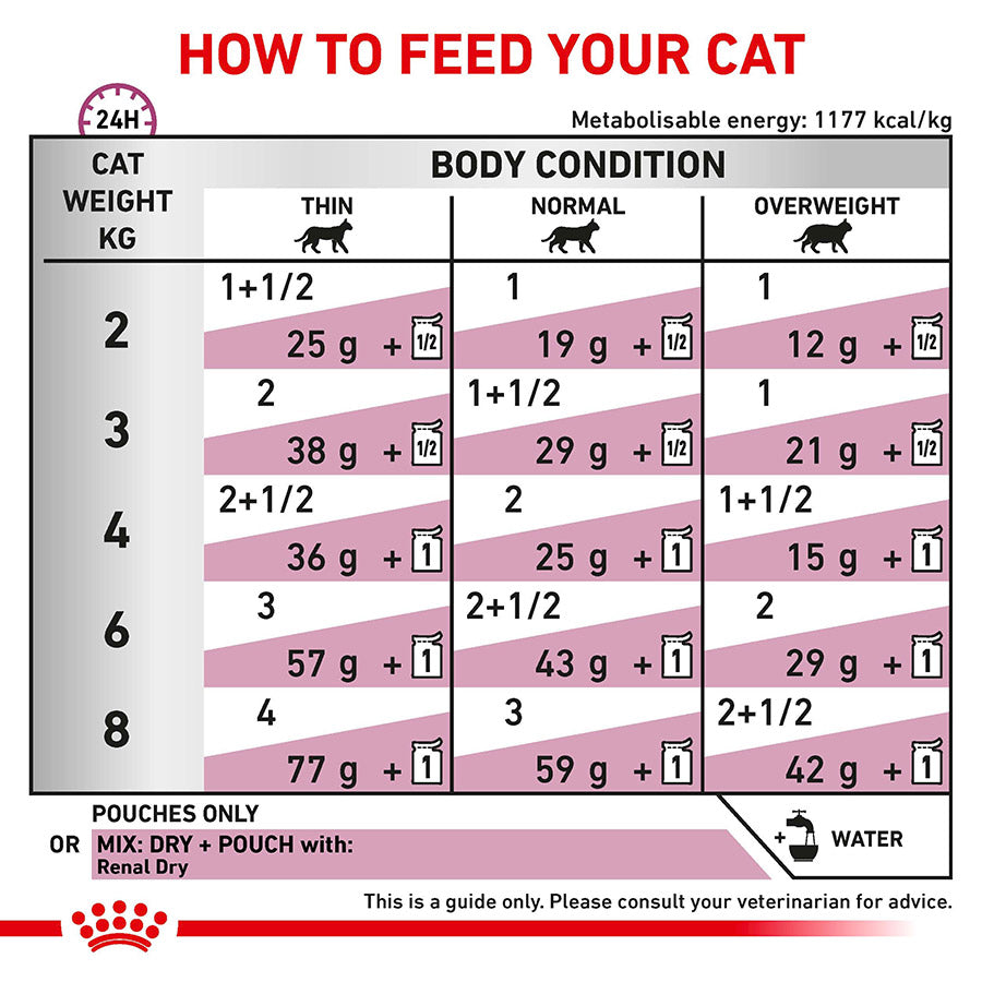 If your cat enjoys a mixed diet of wet and dry food, be sure to reference the on-pack feeding guides to ensure a healthy daily food intake for your cat. Royal Canin Renal Veterinary Health Nutrition diets for cats are formulated to help support kidney function for cats with Chronic Renal Insufficiency. Each formula in the Royal Canin Renal Support range contains specific nutrients to provide your cat with a complete and balanced diet.