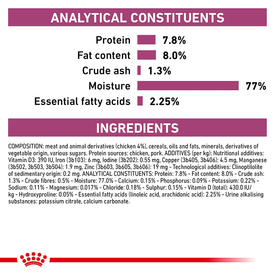 Analytical Constituents: Protein: 7.8%; Crude Fibres: 0.5%; Crude Oils and Fats: 8%; Crude Ash: 1.3%; Moisture: 77%; Omega (3 and/or 6): 2.38%; Calcium: 0.15%;Phosphorus: 0.09%.