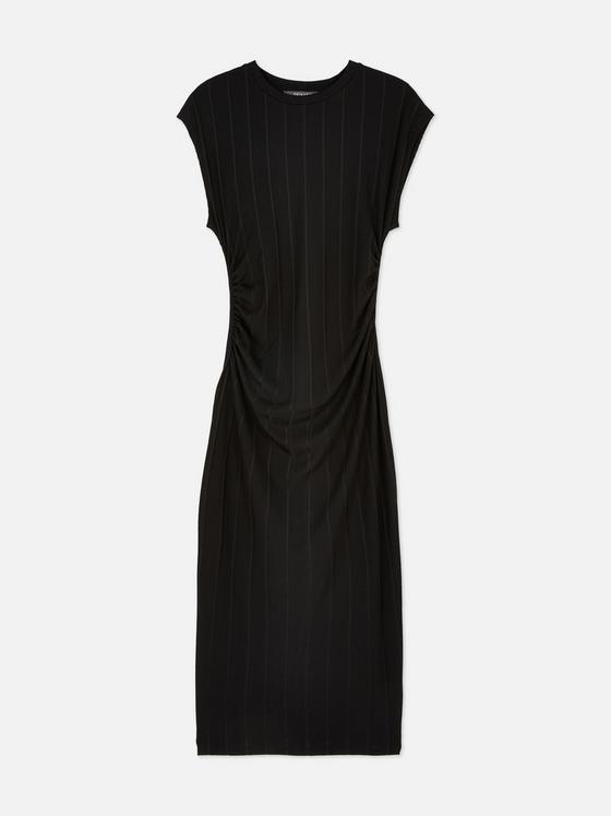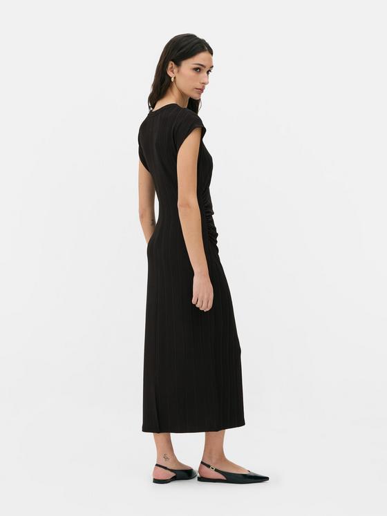 A ribbed midi dress cut to a sleeveless silhouette and finished with ruched detail