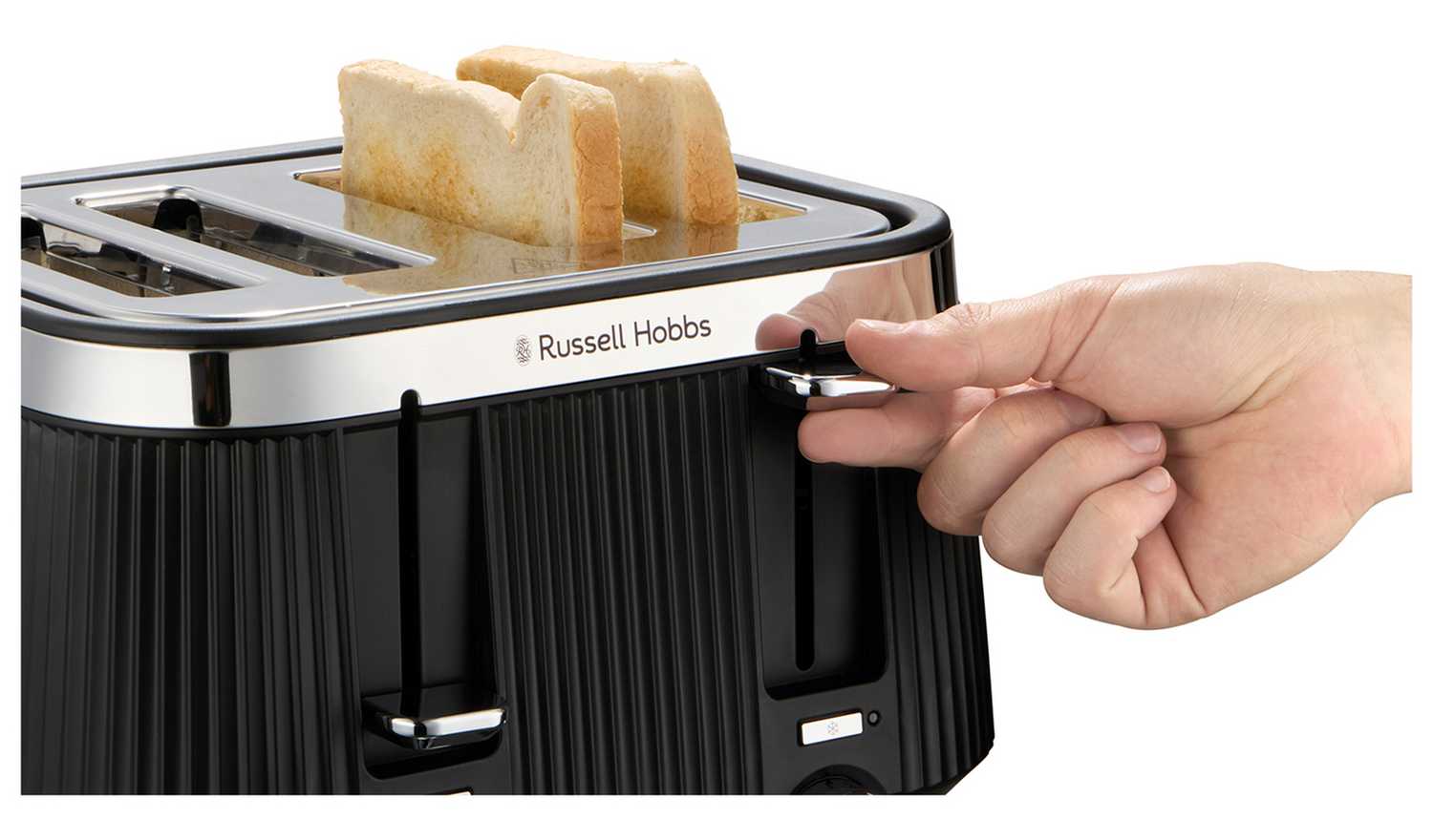 An elegant matte black fluted exterior sits in contrast to the brushed stainless-steel trim making the Russell Hobbs Bronte 4 Slice Toaster Matte Black a stylish addition to your kitchen worktop. Check to see if your slice is just how you like it without stopping the cycle with the Lift and Look feature. And the high lift lever lets you retrieve smaller snacks like bagels without risking your fingers in the heat.