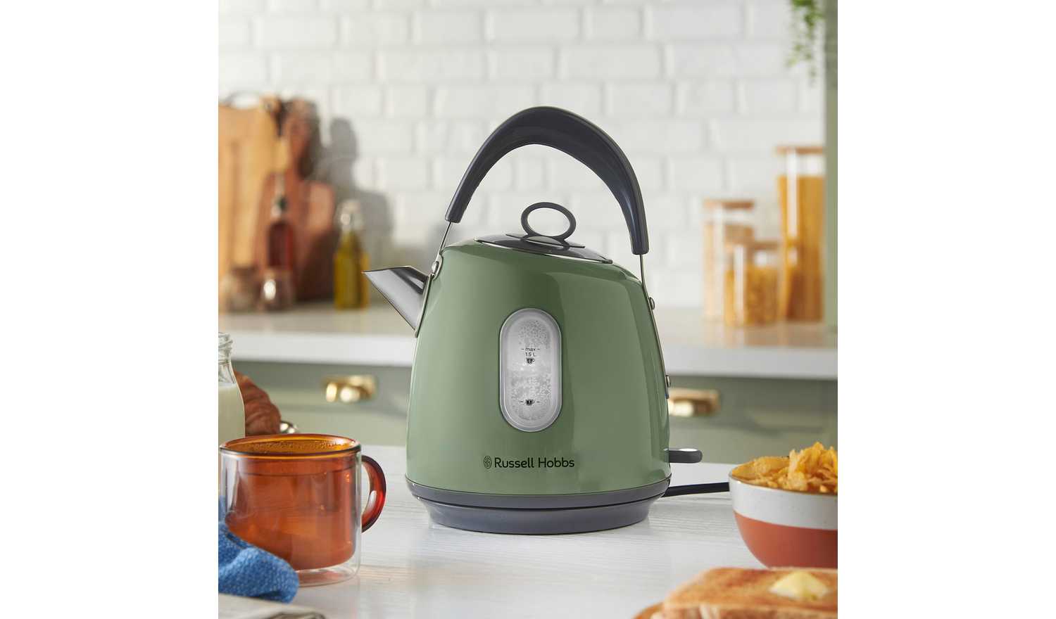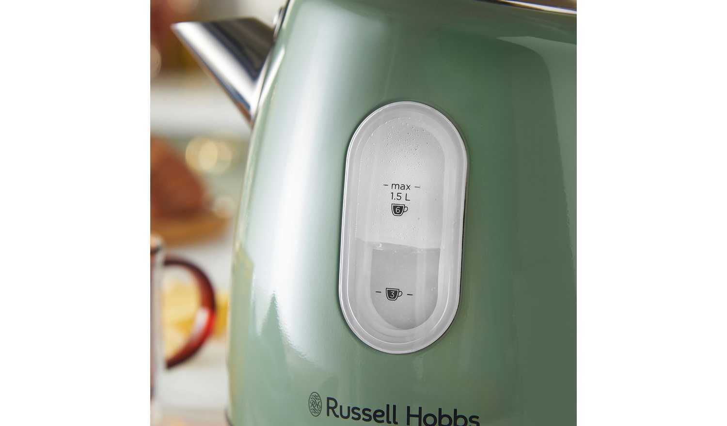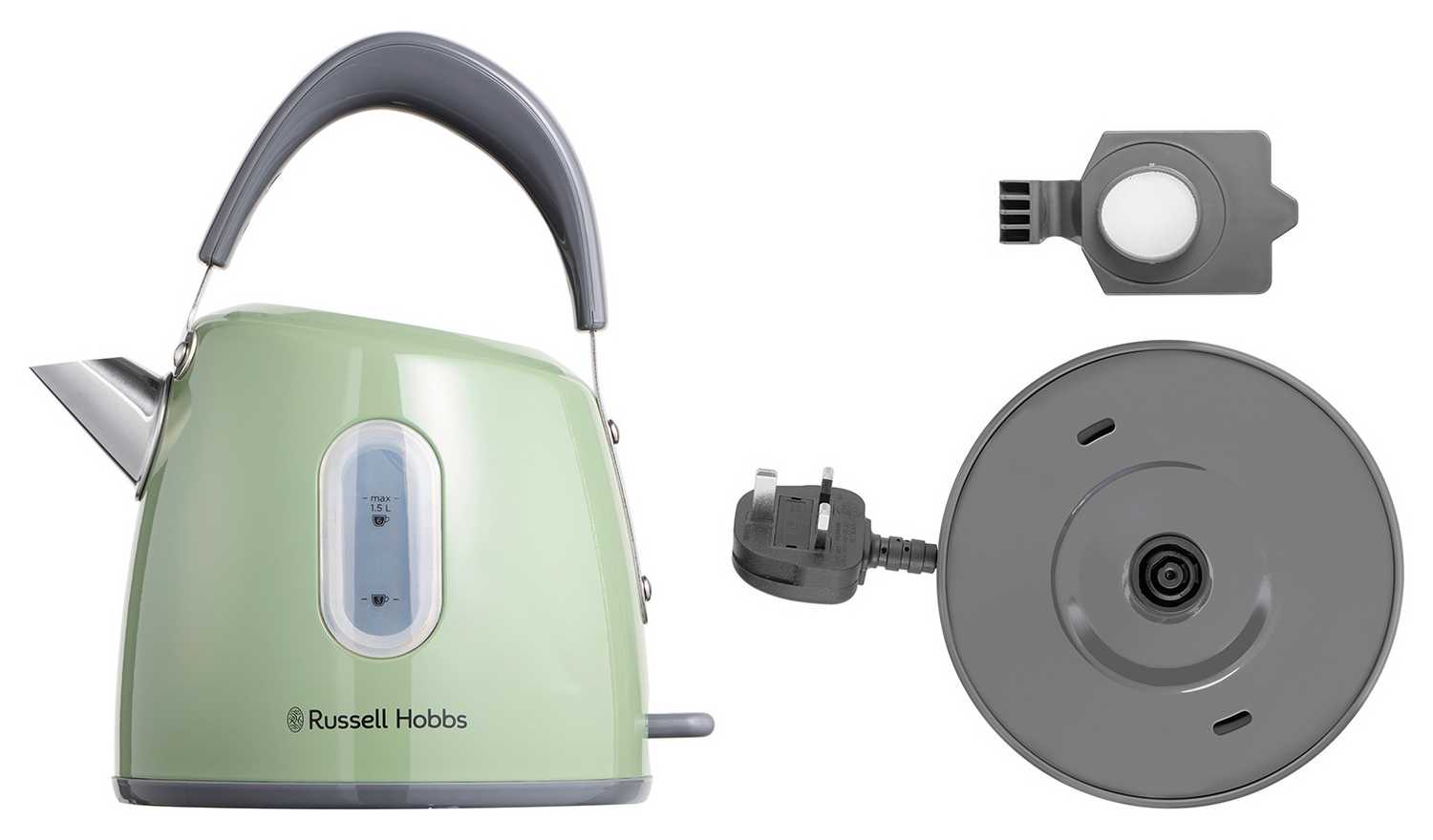 As a beautiful focal point to complement any style of kitchen, the Russell Hobbs Stylevia Sage Kettle is a perfect blend of traditional style with modern functionality. It's delightful sage green exterior with a 1.5L capacity interior lights up in a pleasant white hue when boiling. The water level indicator shows handy cup measures, so you never need to boil more than you need, while the striking up-and-over handle and pull-off lid makes refilling and pouring comfortably easy.